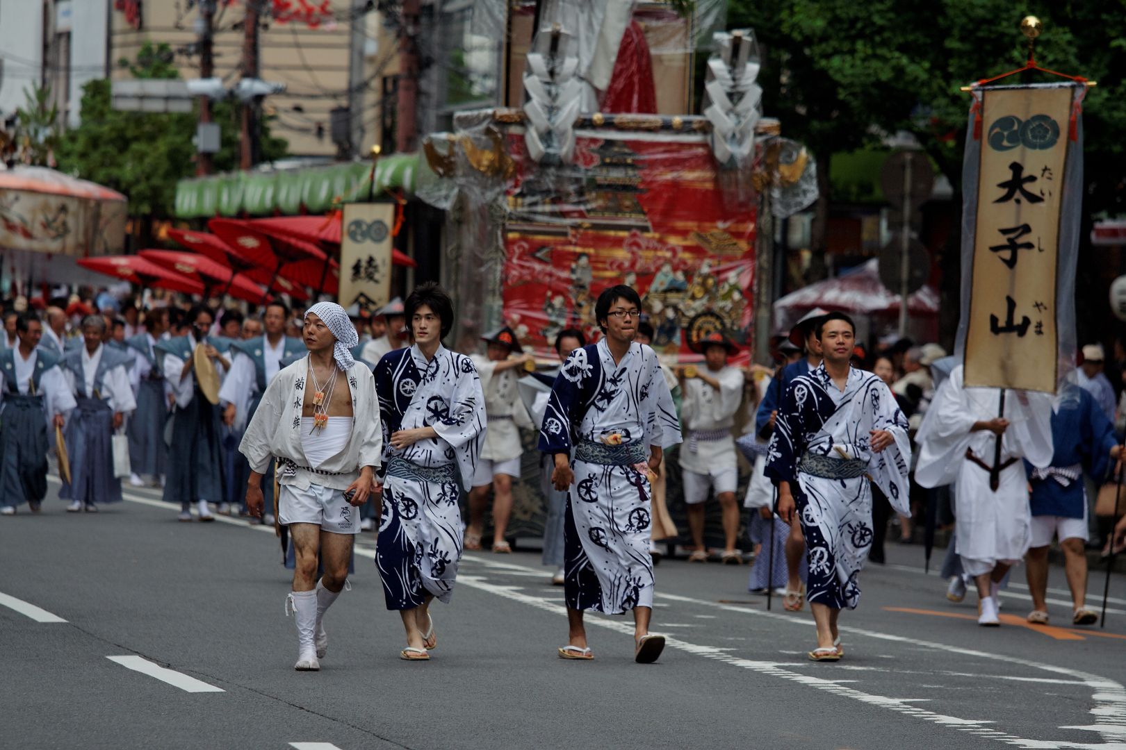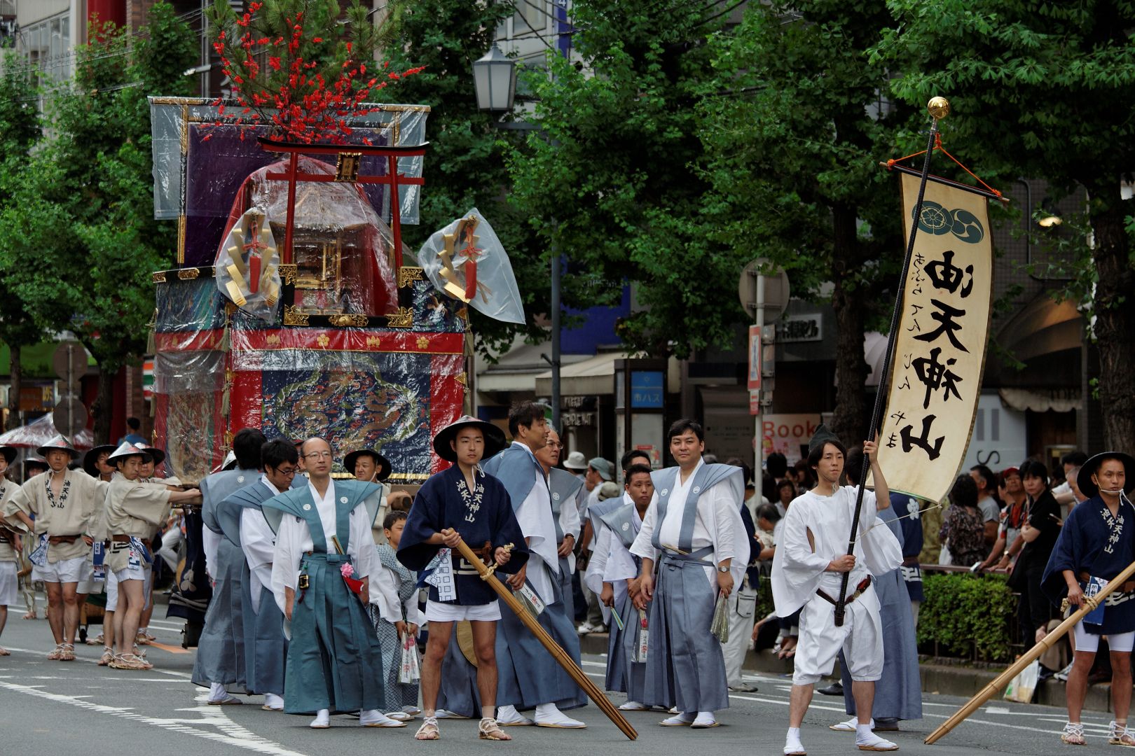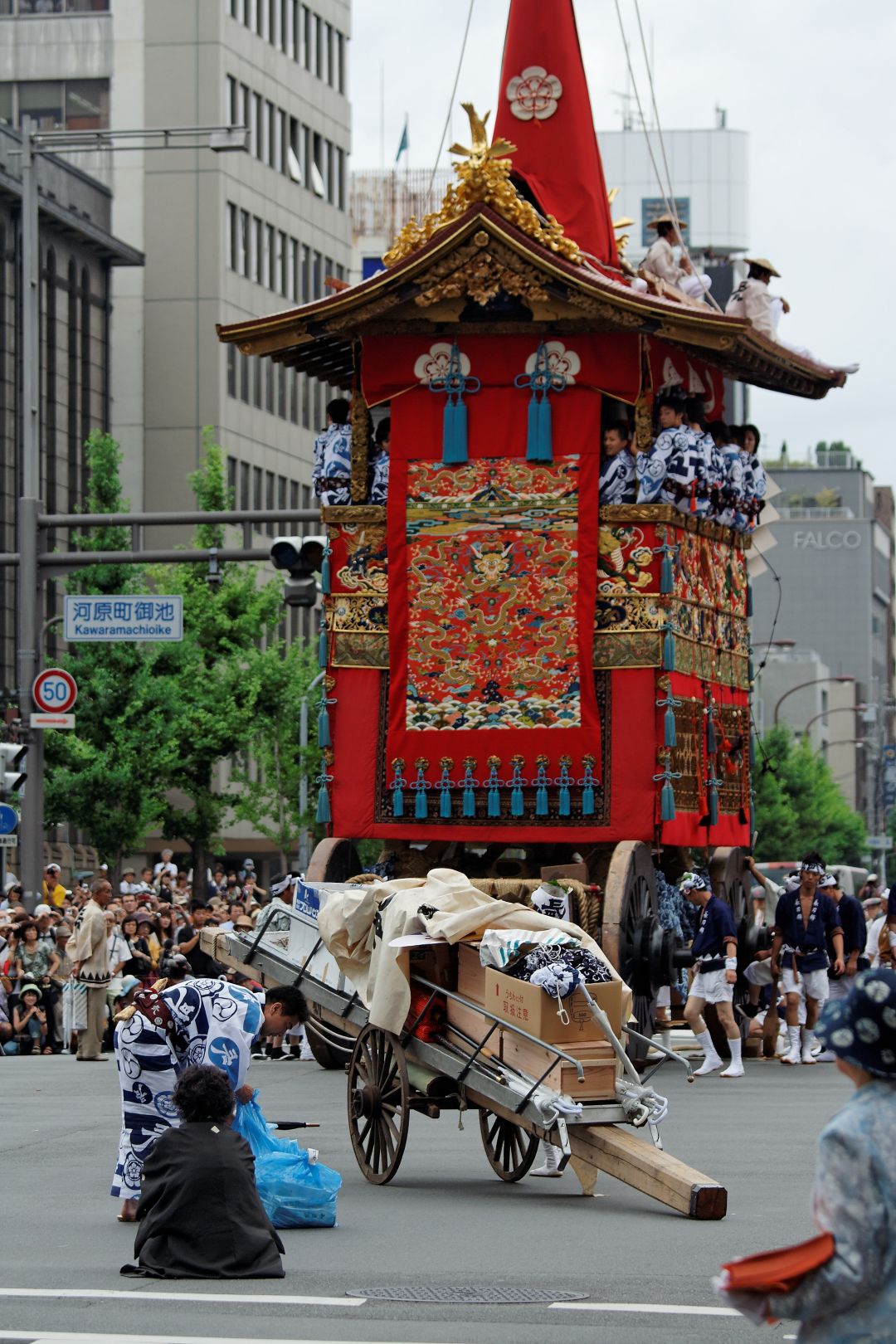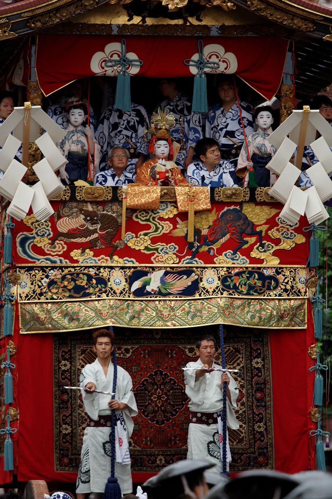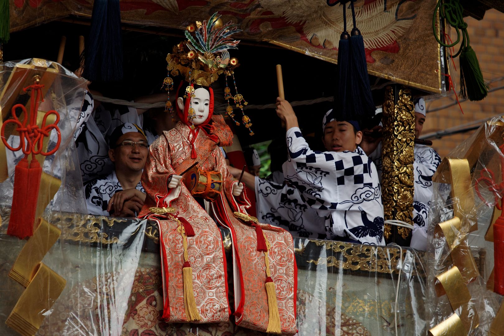 Pour protéger la ville des épidemies et des tremblements de terre, les dieux quittent leurs sanctuaires périphériques et paradent à travers les rues, au coeur de la ville. Deux flottes de chars, les Hoko et les Yama, sont assemblées pour abriter temporairement les dieux. Les plus grands chars, les Hoko, font 12 m de haut et peuvent peser jusqu'à 12 tonnes.