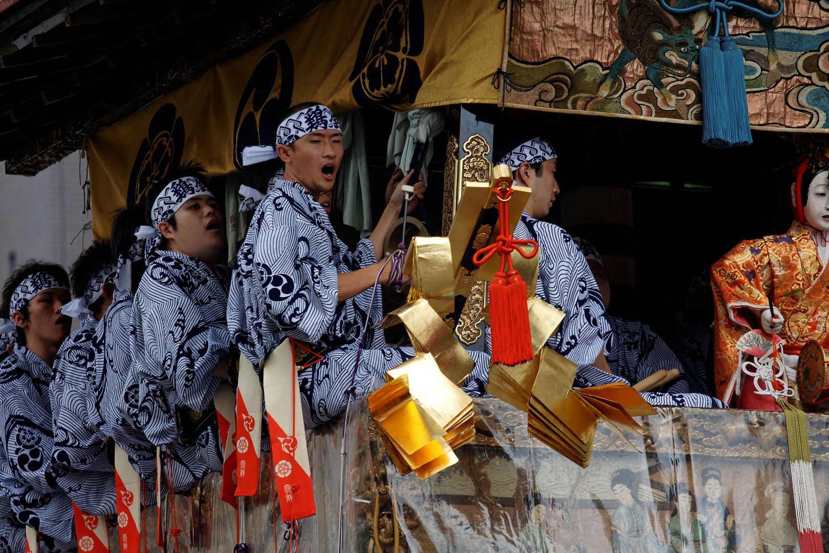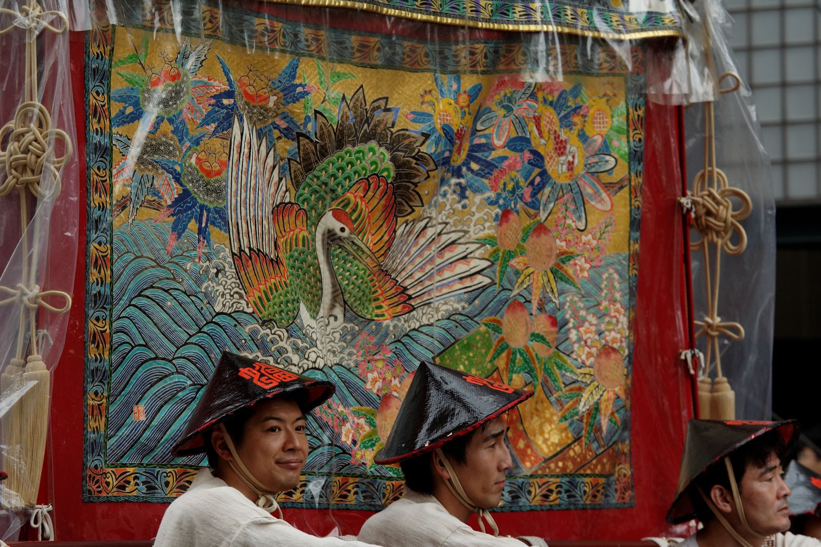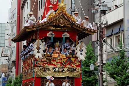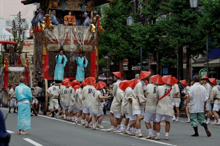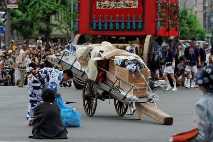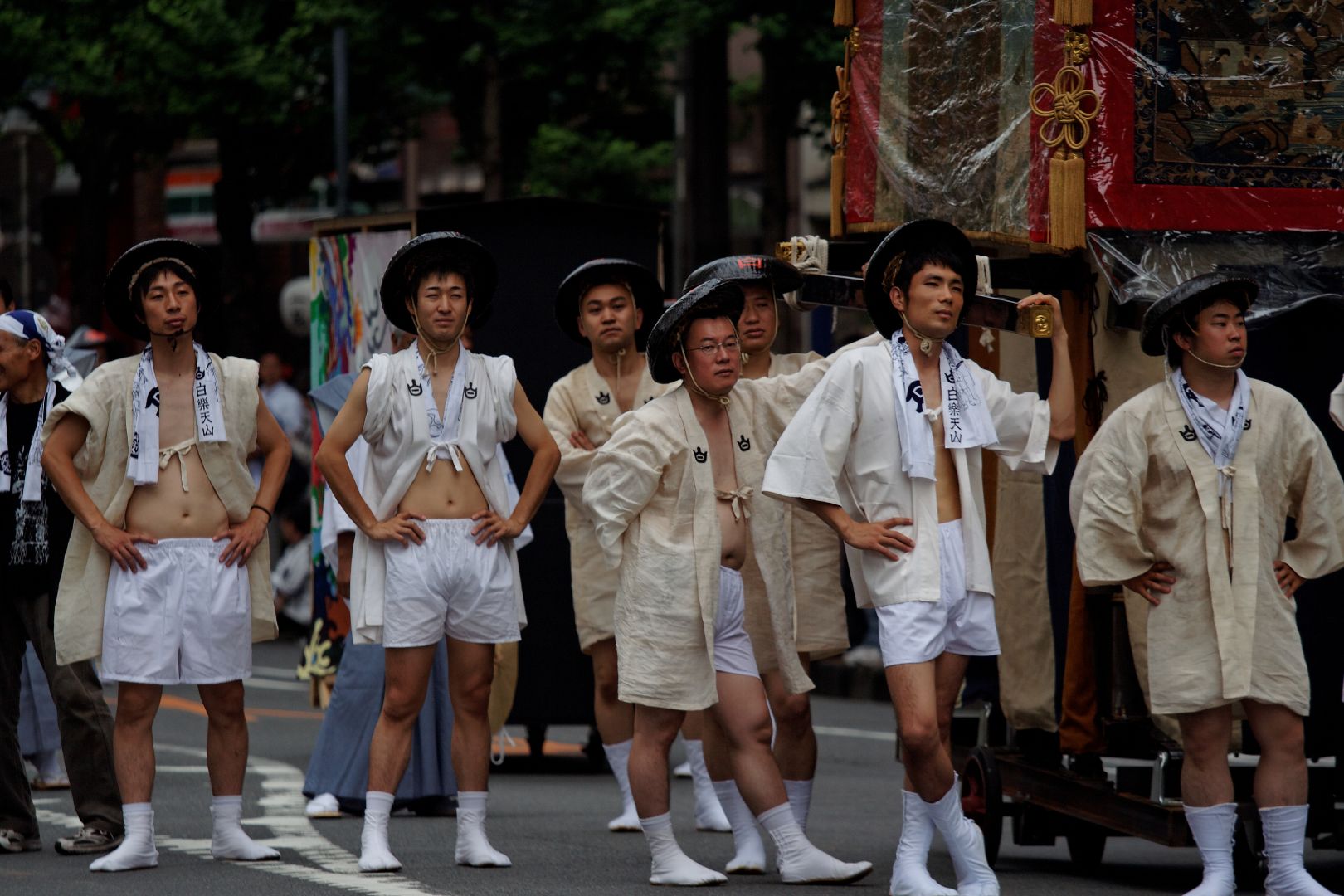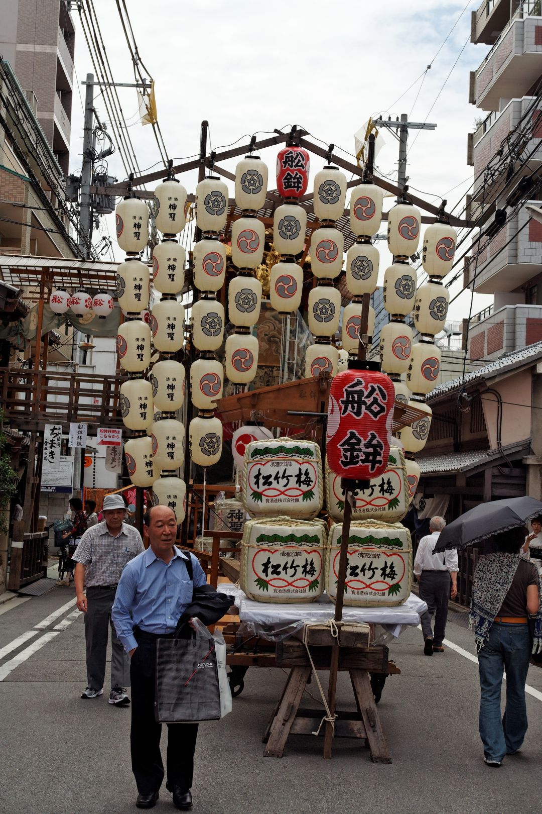 Pour protéger la ville des épidemies et des tremblements de terre, les dieux quittent leurs sanctuaires périphériques et paradent à travers les rues, au coeur de la ville. Deux flottes de chars, les Hoko et les Yama, sont assemblées pour abriter temporairement les dieux. Les plus grands chars, les Hoko, font 12 m de haut et peuvent peser jusqu'à 12 tonnes.