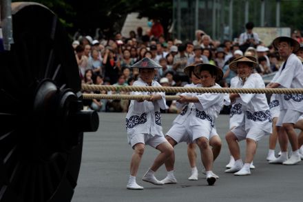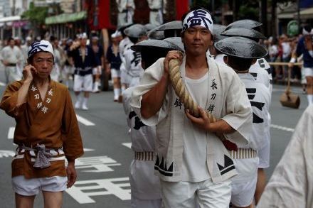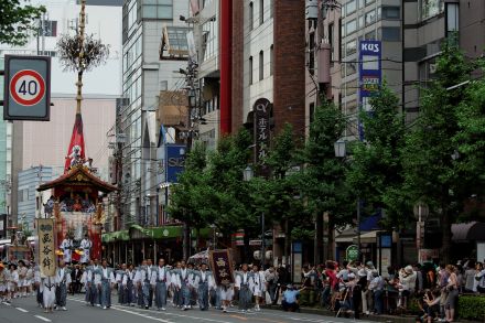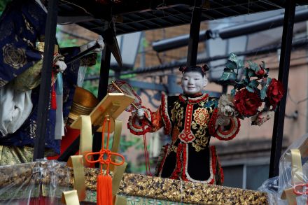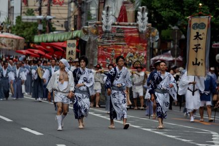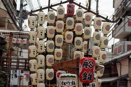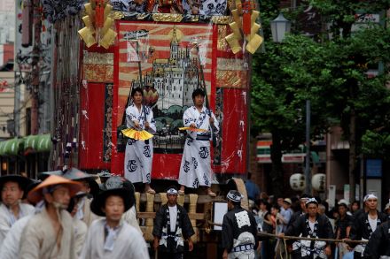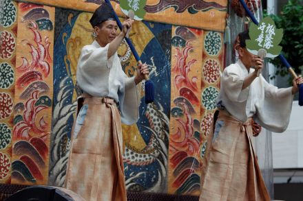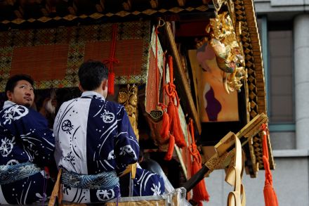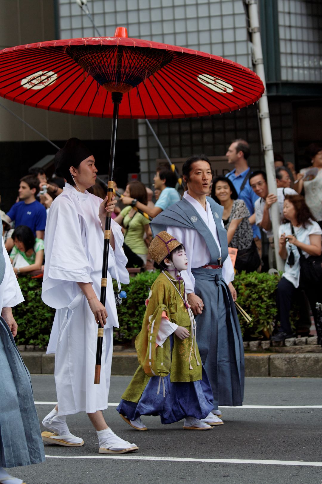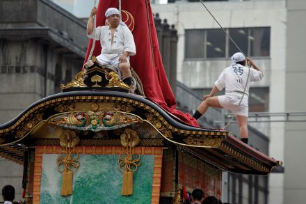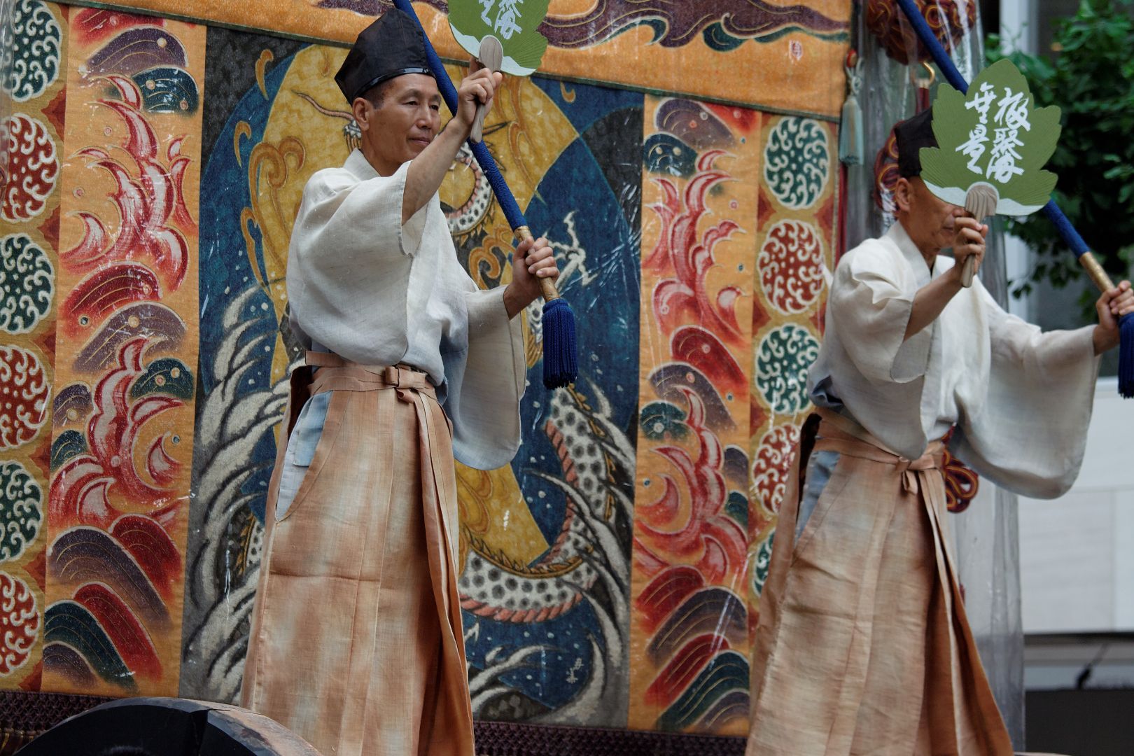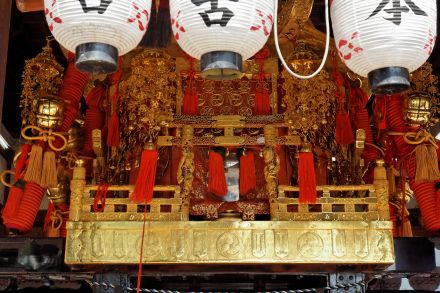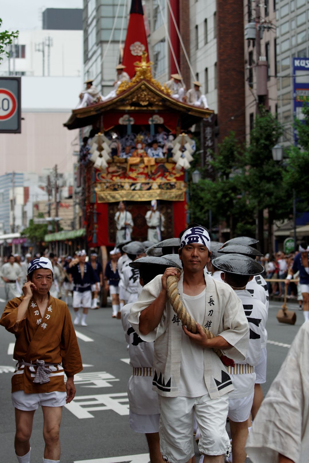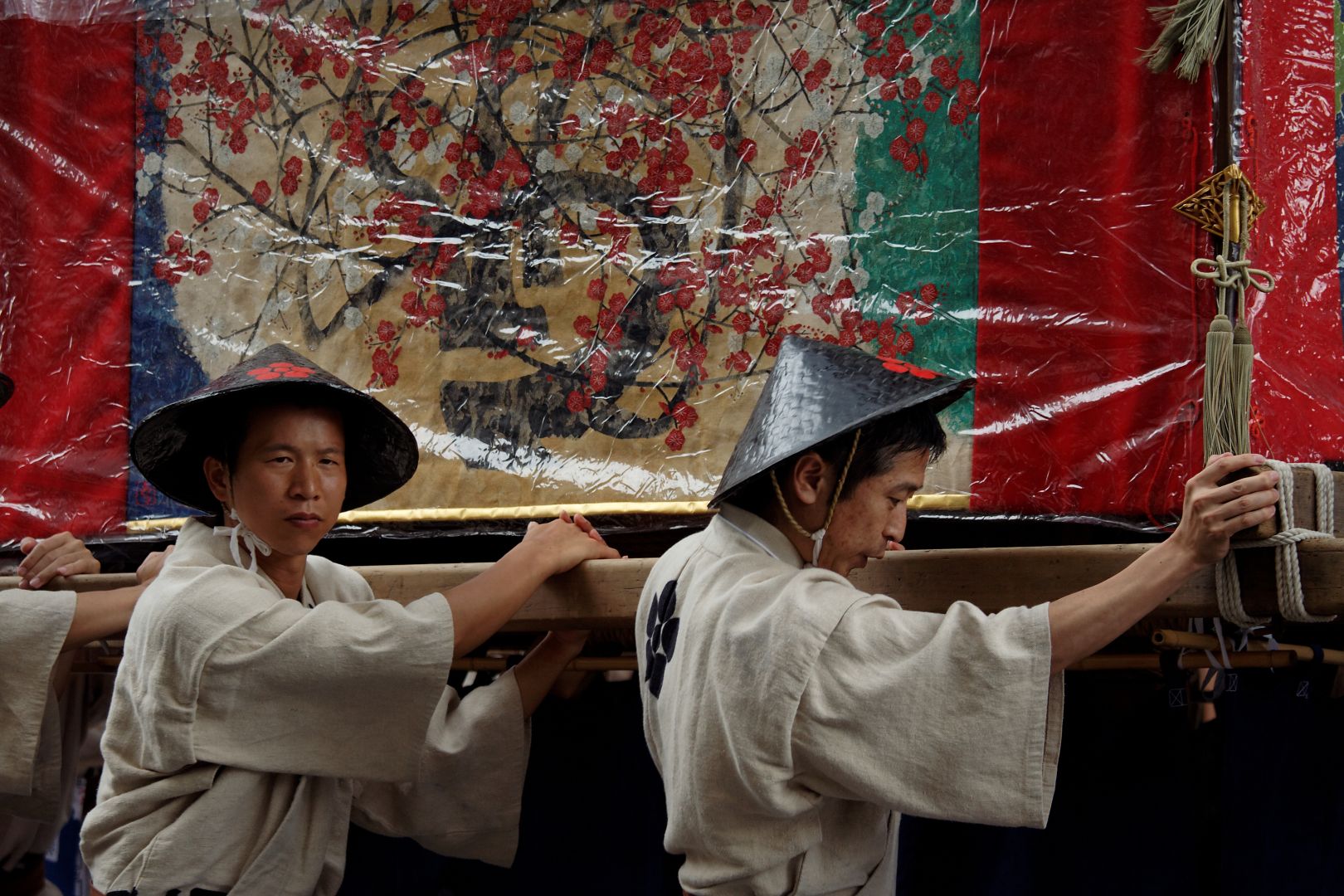 Pour protéger la ville des épidemies et des tremblements de terre, les dieux quittent leurs sanctuaires périphériques et paradent à travers les rues, au coeur de la ville. Deux flottes de chars, les Hoko et les Yama, sont assemblées pour abriter temporairement les dieux. Les plus grands chars, les Hoko, font 12 m de haut et peuvent peser jusqu'à 12 tonnes.