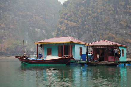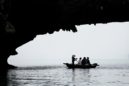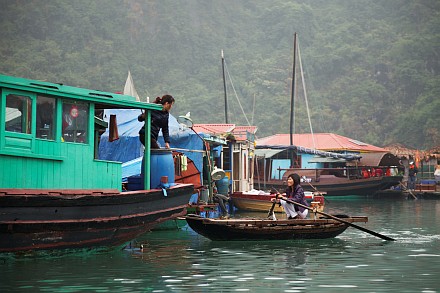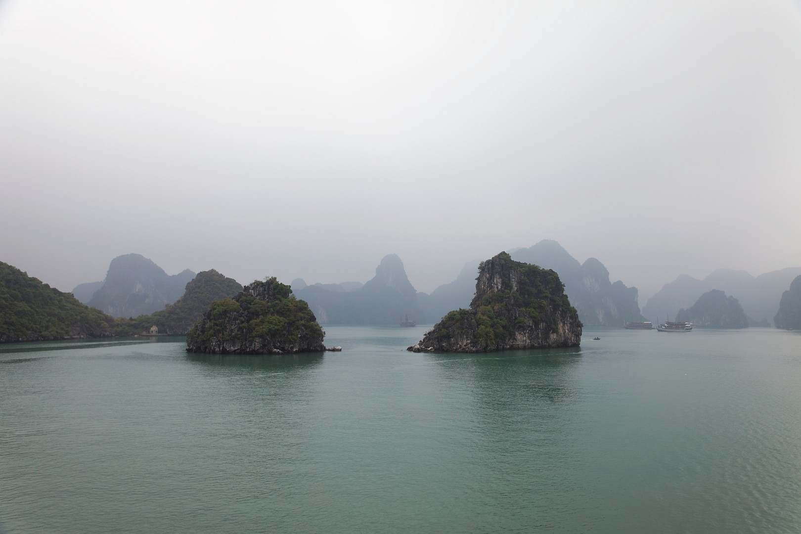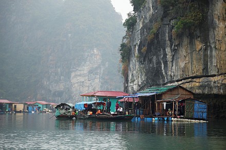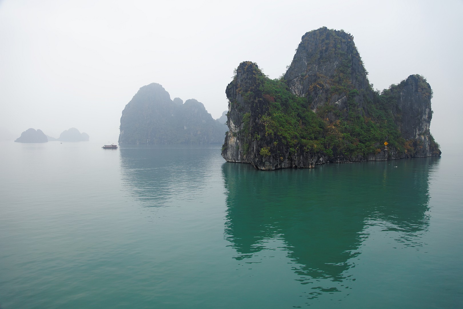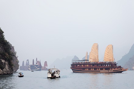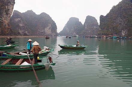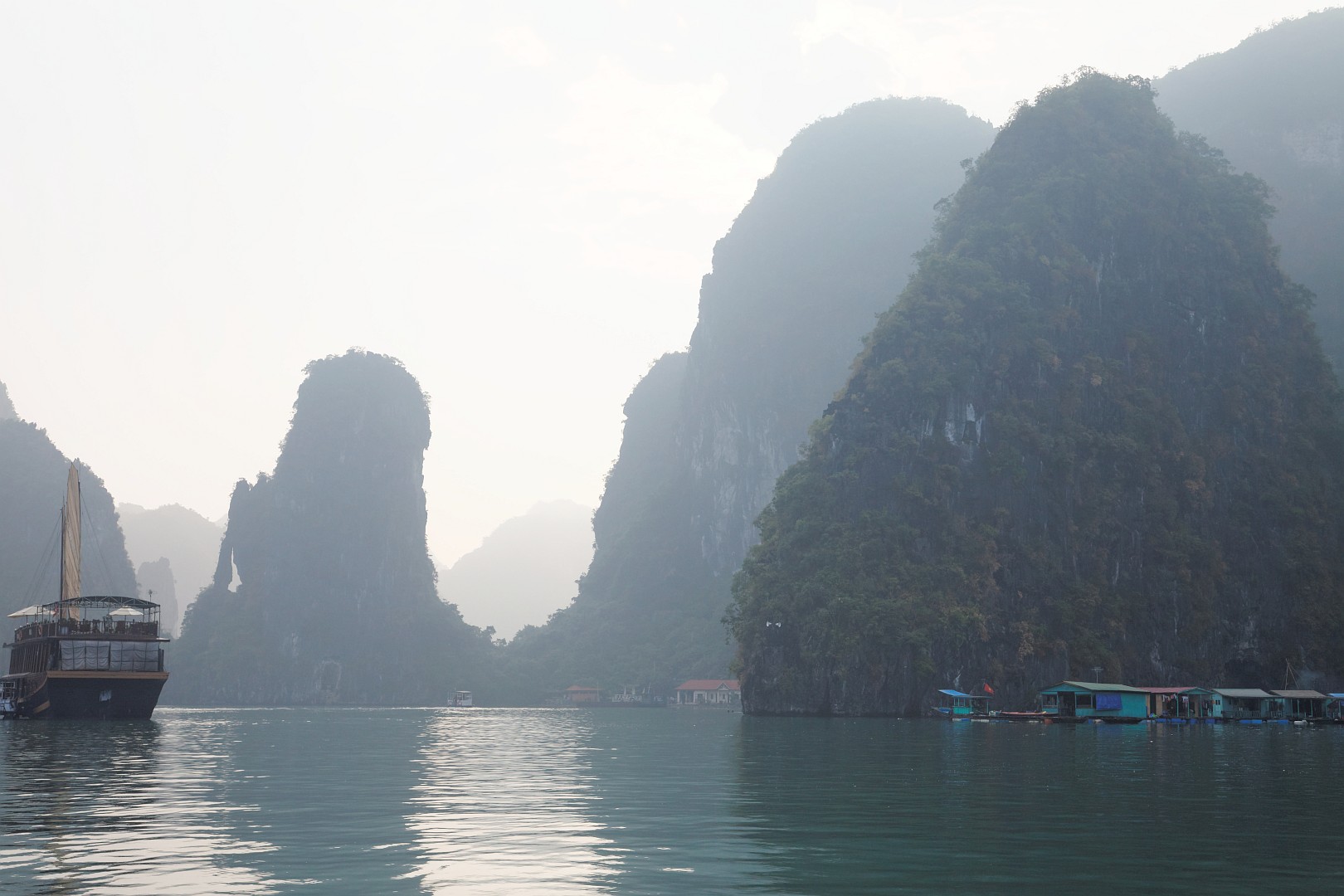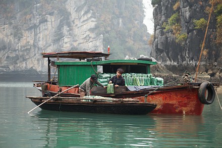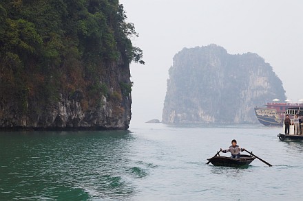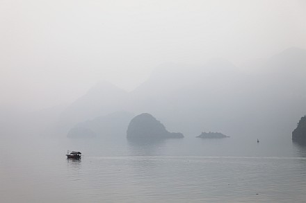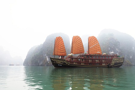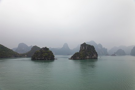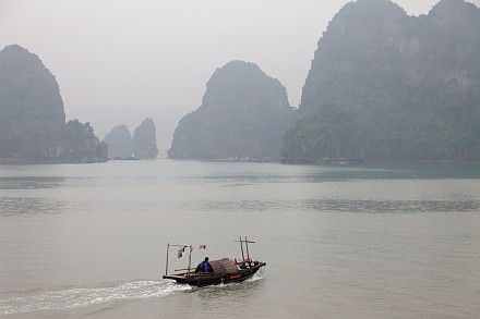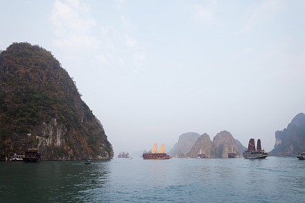 23 décembre 2010. La baie d'Halong est constituée d'environ 3000 îlots rocheux qui se dressent au milieu de la mer et des brumes. De grandes jonques luxueuses sillonnent la baie pour le plus grand plaisir des touristes. La navigation s'accompagne d'une promenade en barque à travers un village de pêcheurs et de la visite de la grotte Hang Sung Sot, dite grotte des surprises.