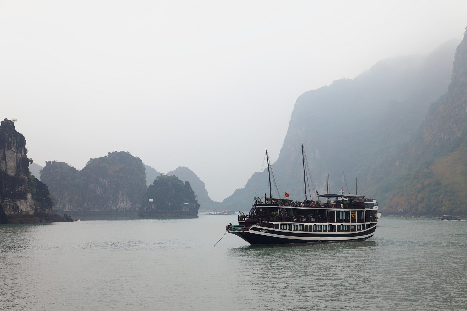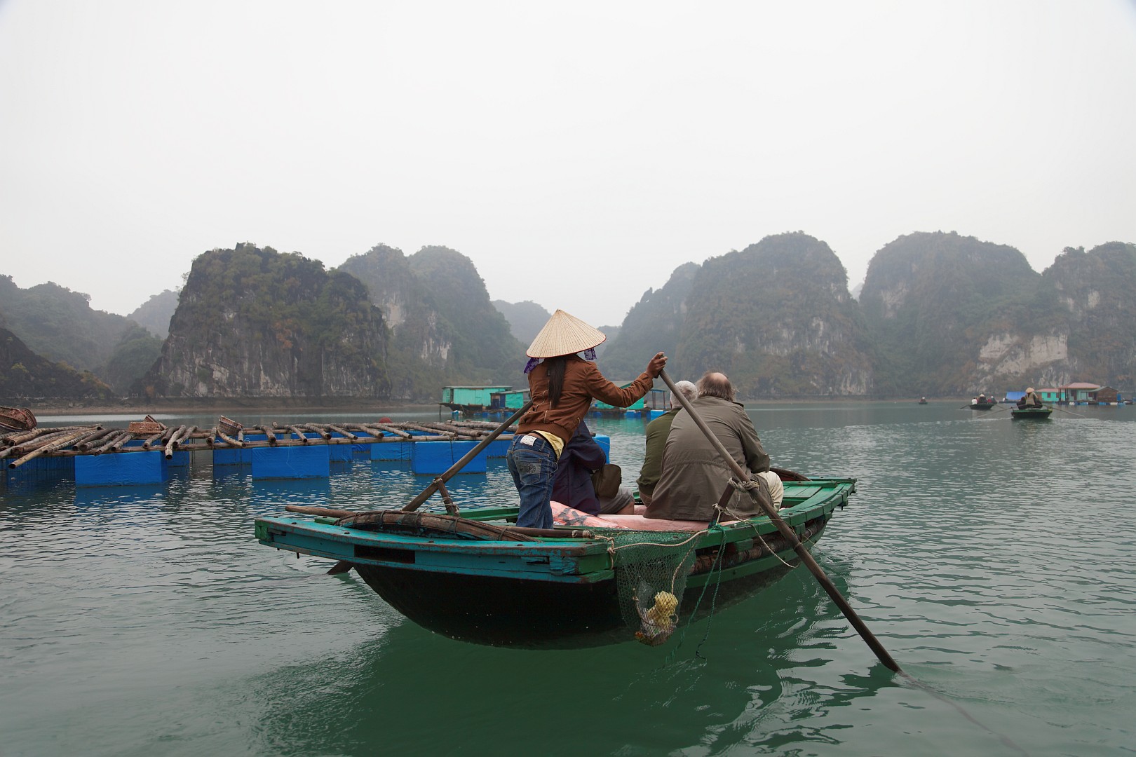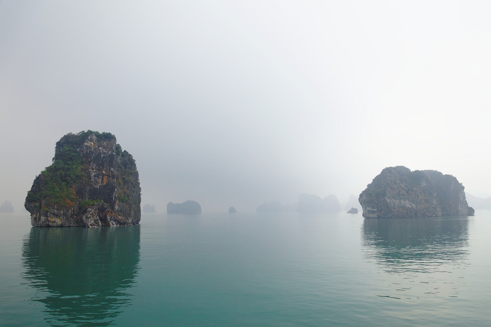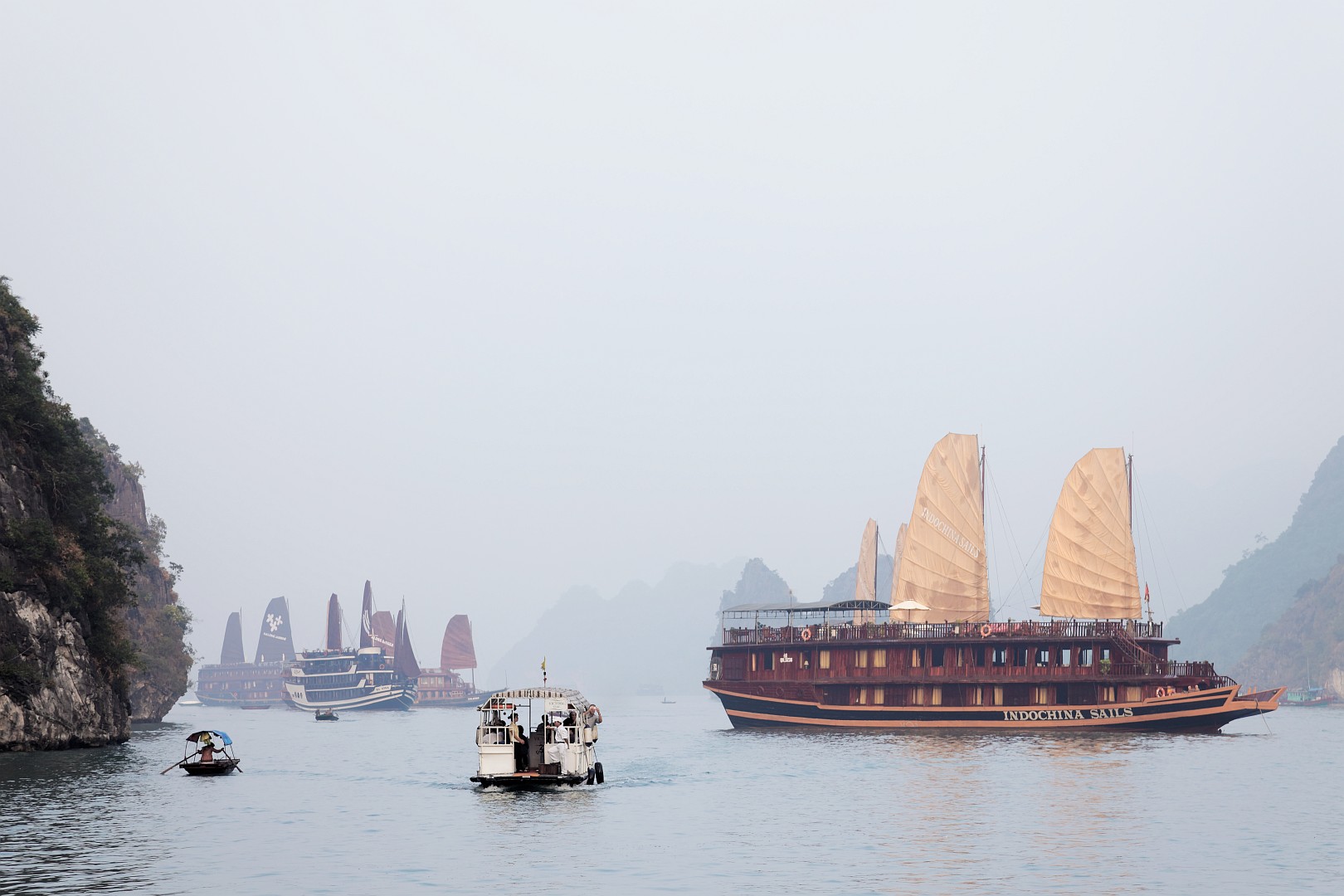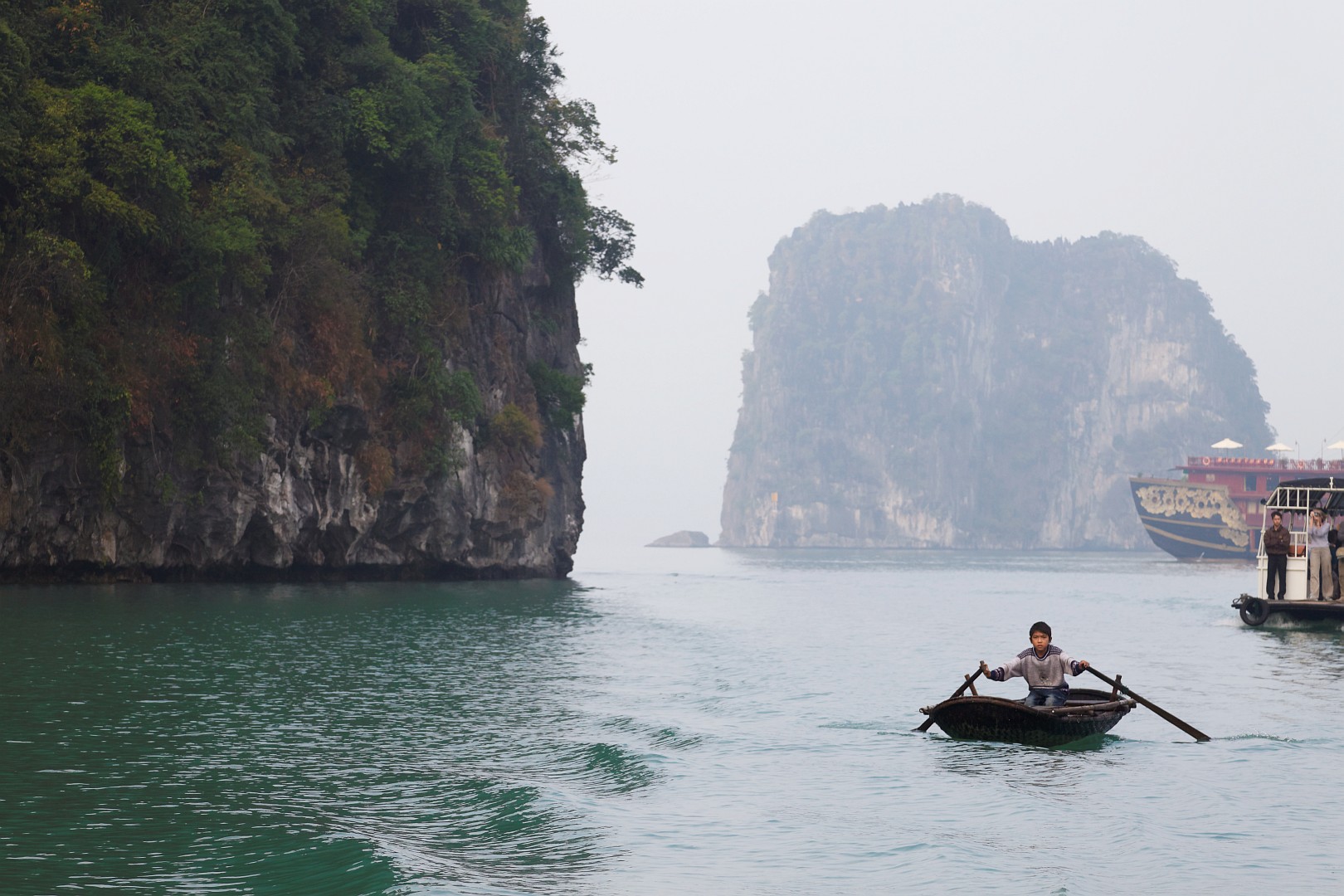 23 décembre 2010. La baie d'Halong est constituée d'environ 3000 îlots rocheux qui se dressent au milieu de la mer et des brumes. De grandes jonques luxueuses sillonnent la baie pour le plus grand plaisir des touristes. La navigation s'accompagne d'une promenade en barque à travers un village de pêcheurs et de la visite de la grotte Hang Sung Sot, dite grotte des surprises.