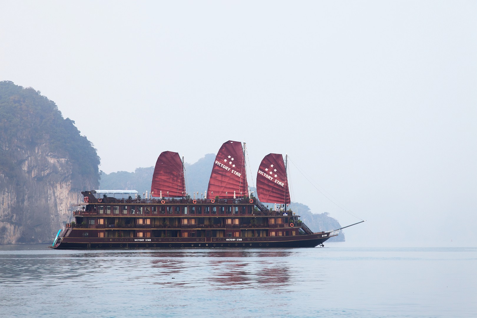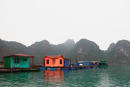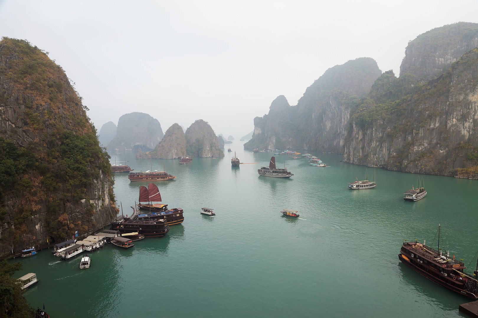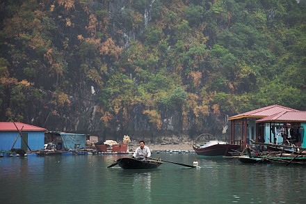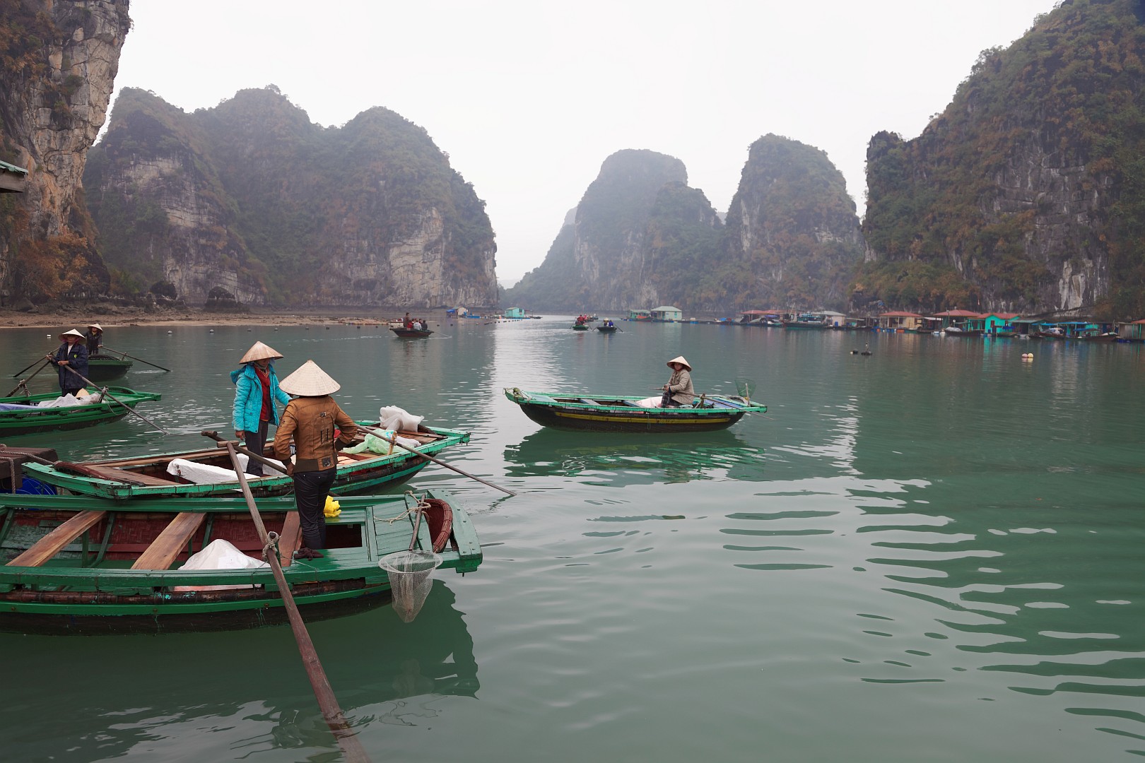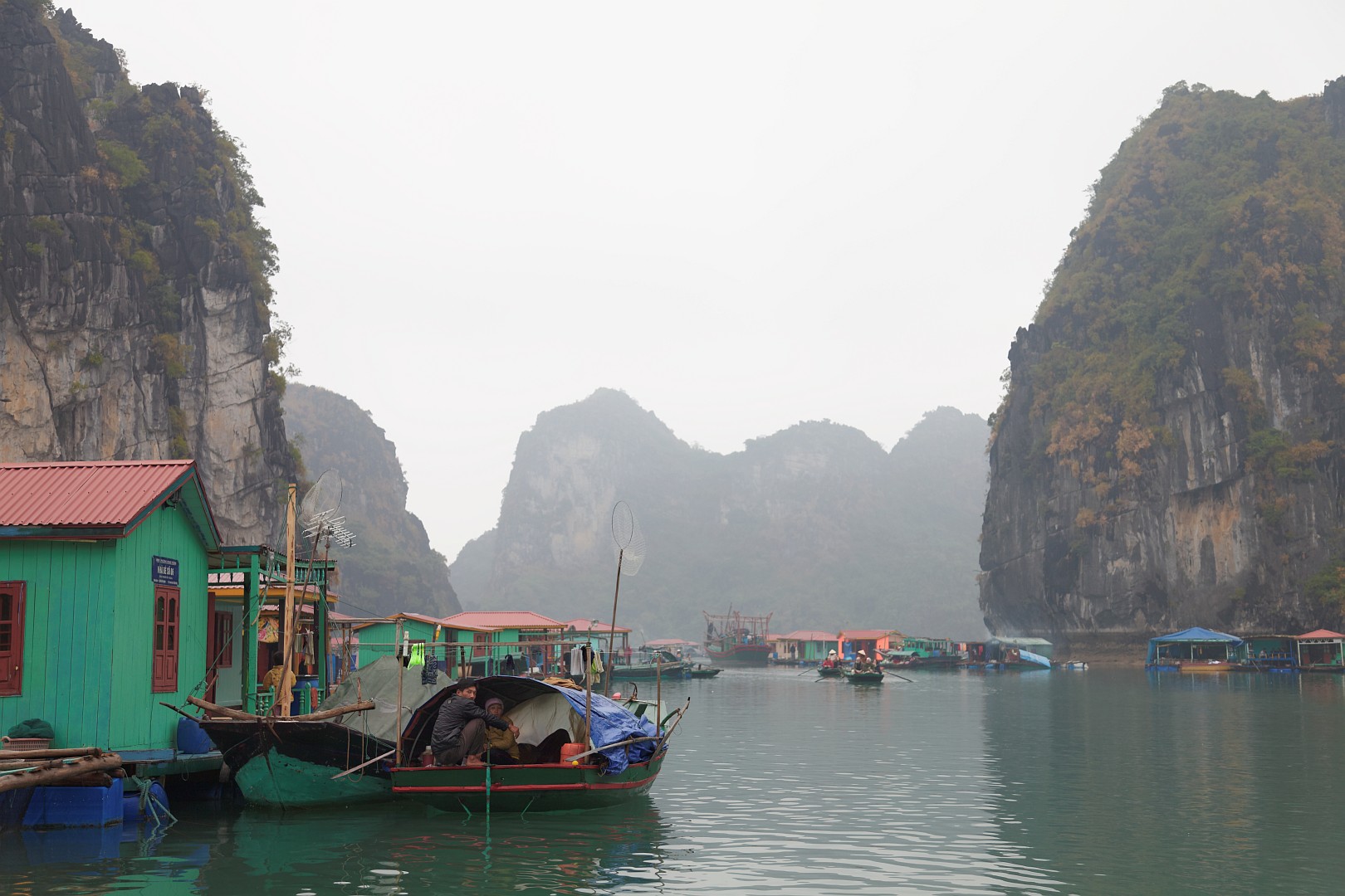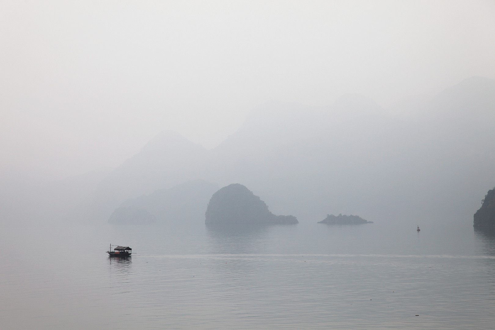 23 décembre 2010. La baie d'Halong est constituée d'environ 3000 îlots rocheux qui se dressent au milieu de la mer et des brumes. De grandes jonques luxueuses sillonnent la baie pour le plus grand plaisir des touristes. La navigation s'accompagne d'une promenade en barque à travers un village de pêcheurs et de la visite de la grotte Hang Sung Sot, dite grotte des surprises.
