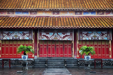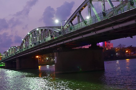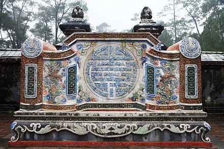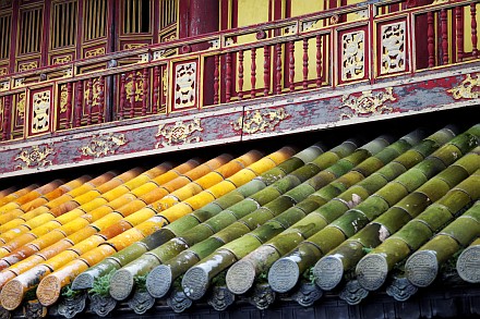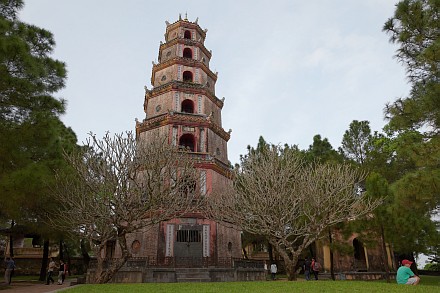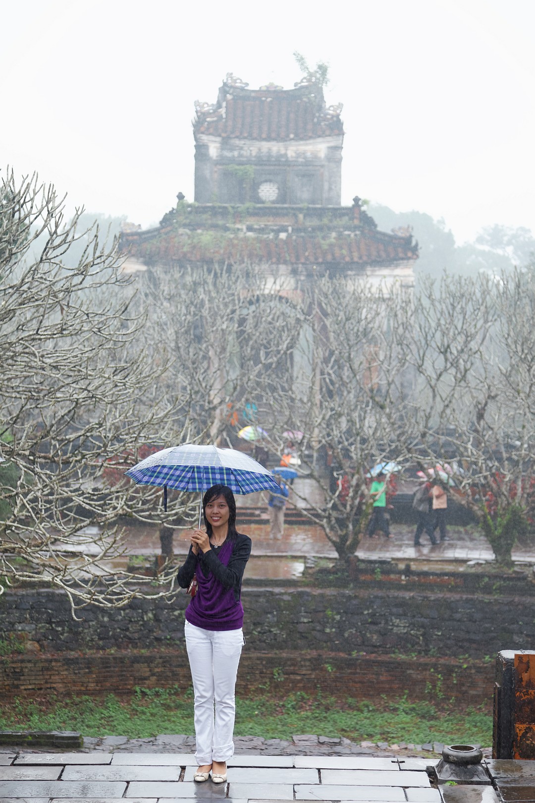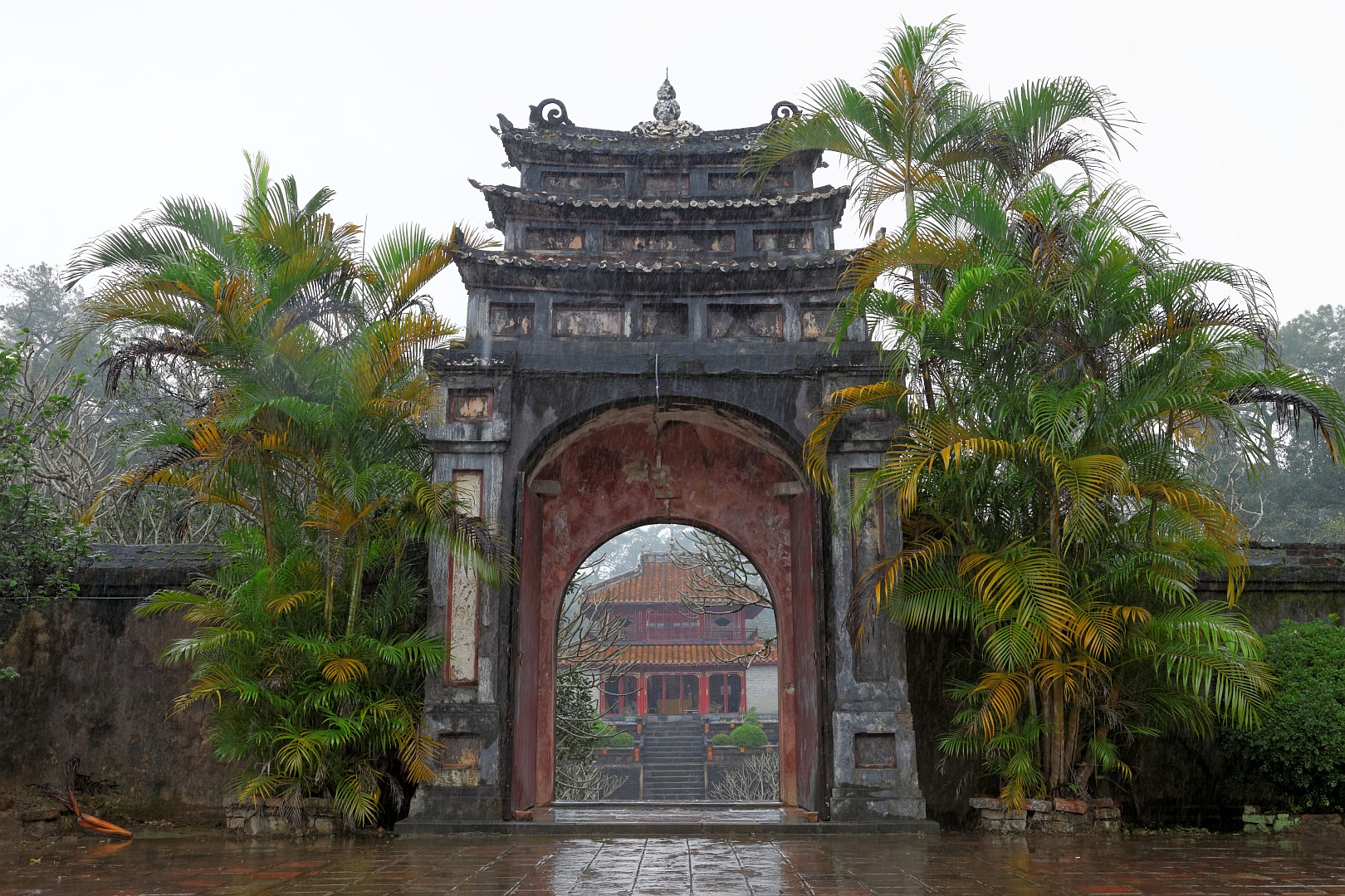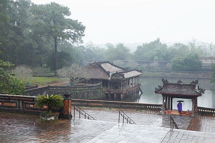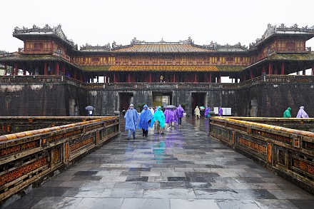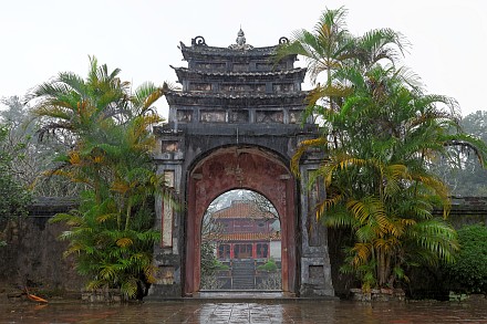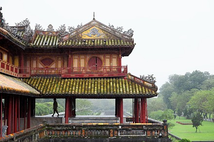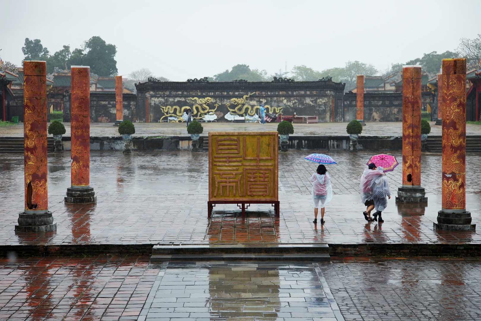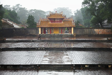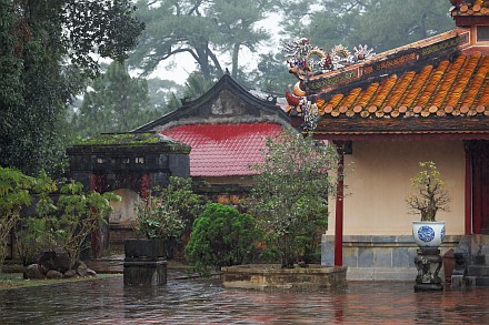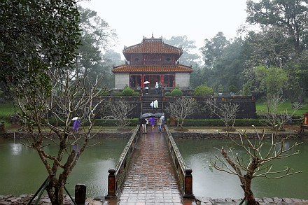 25 décembre 2010. Hué, ancienne cité impériale, s'étend paresseusement le long de la Rivière des Parfums. L'après-midi commence par la visite de la pagode de Thiên Mu, puis par une croisière sur la Rivière des Parfums. Nous découvrons ainsi le pont Trang Tien, anciennement Clémenceau, à la tombée du jour. La soirée se poursuit par un dîner en costume traditionnel de la cour de l'empereur Nguyen. Le lendemain, pluie. Cela ne nous arrête pas pour visiter les tombeaux de Minh Mang, de Tu Duc et la cité impériale. Construite de 1804 à 1833 sur l’initiative de Gia Long, le fondateur de la dynastie des Nguyen, sur un périmètre de 10 km, elle s’inspire de l’architecture des palais impériaux chinois.