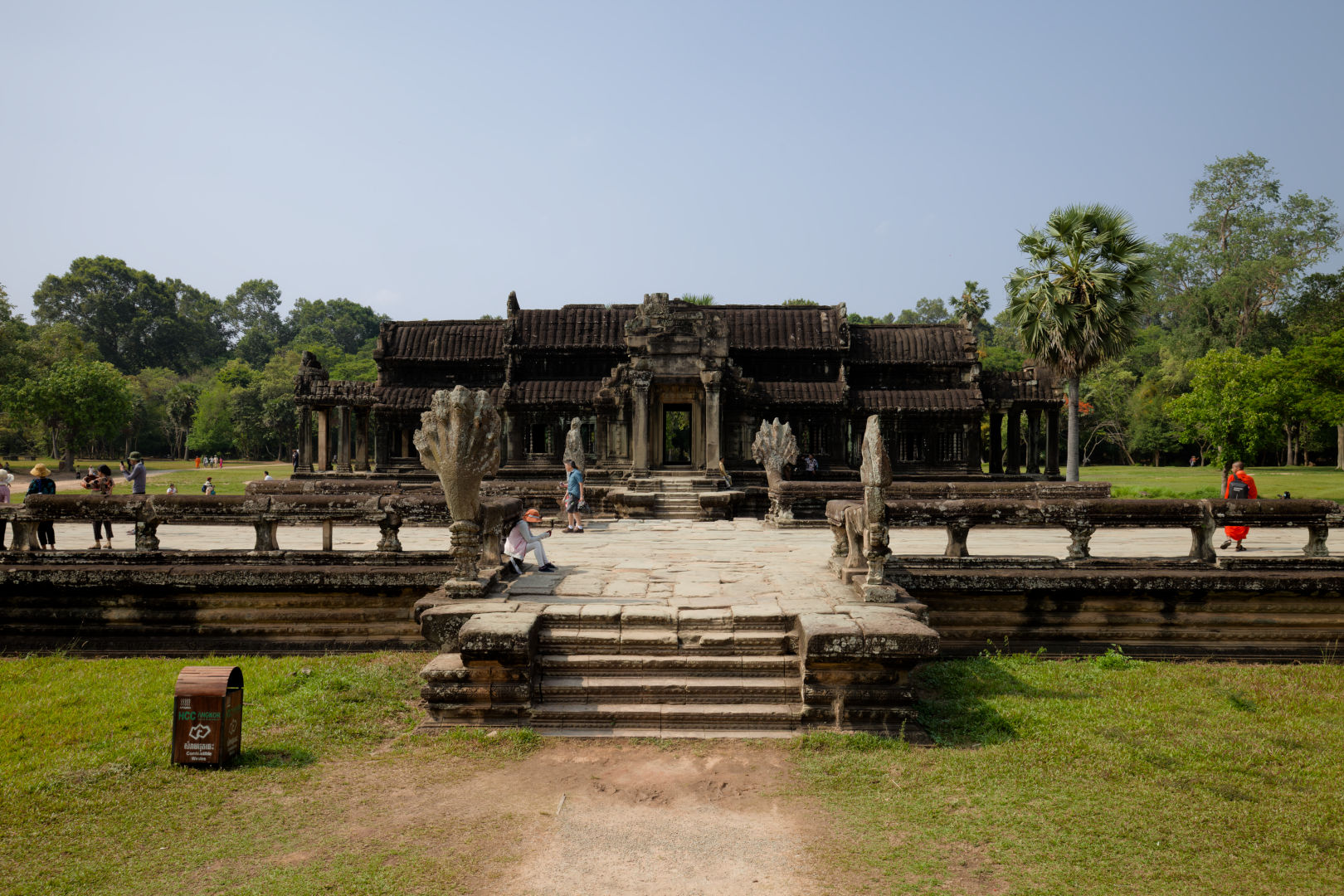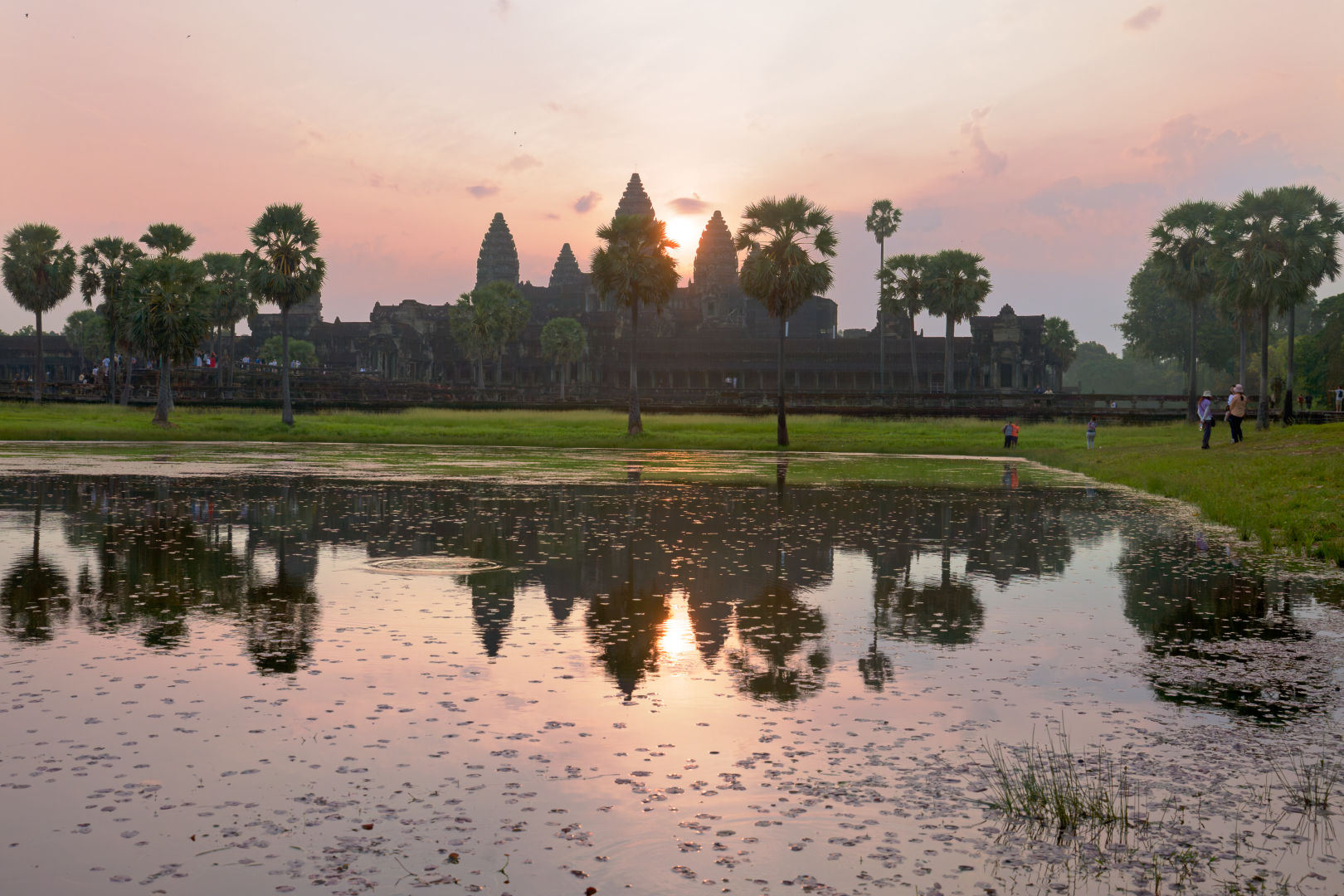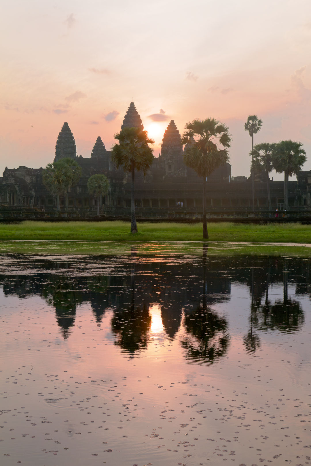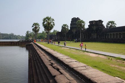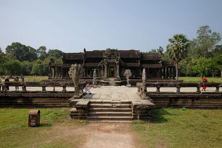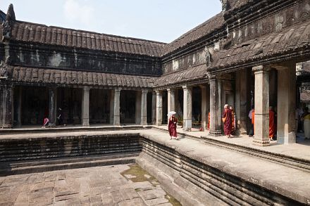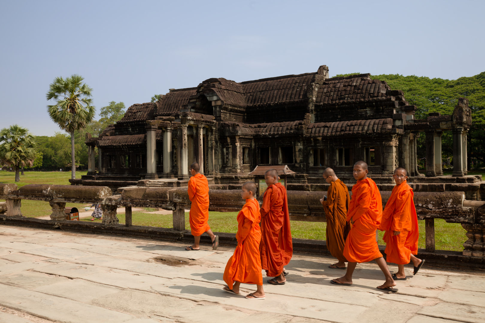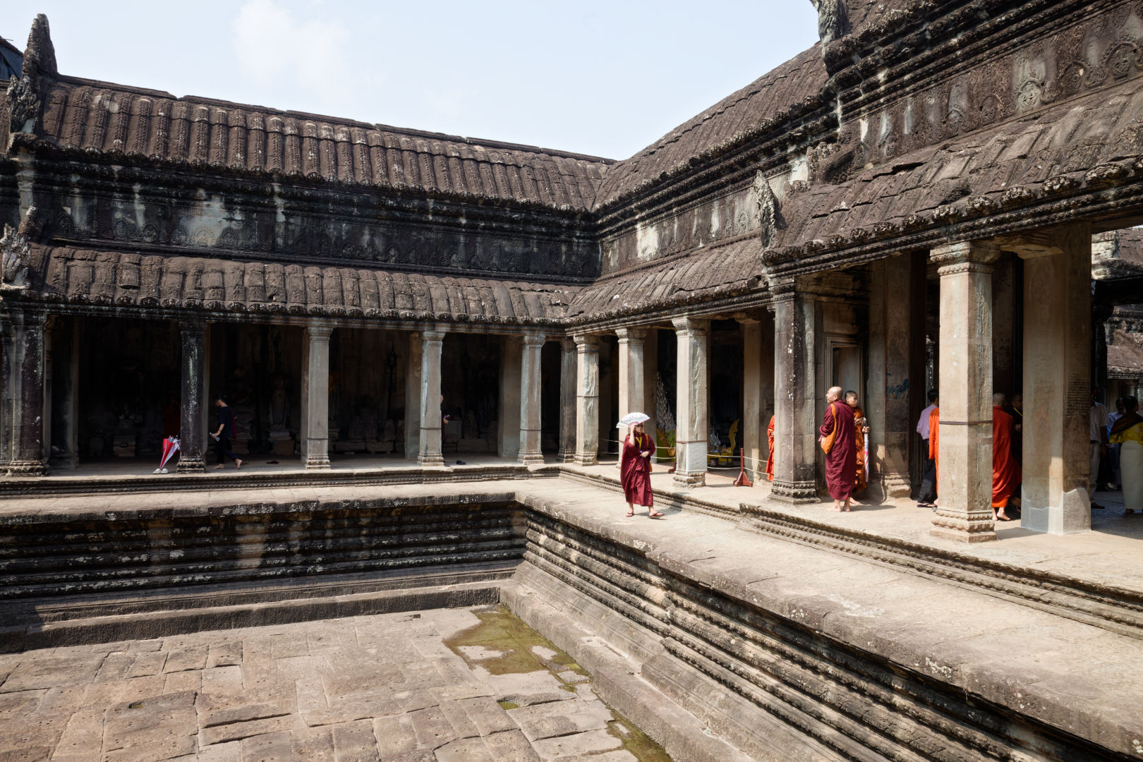 Angkor Vat est le plus grand monument religieux du monde. Initialement hindou et dédié au dieu Vishnou, il a été construit durant la première moitié du XIIème siècle par le roi Suryavarman II. Il a progressivement été transformé en temple bouddhiste vers la fin du XIIème siècle. Orienté vers l'ouest, Angkor Vat comprend trois galeries rectangulaires et concentriques à l'intérieur de son mur d'enceinte entouré d'une large douve de 5 km de long.
