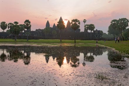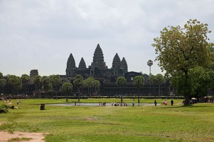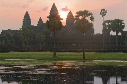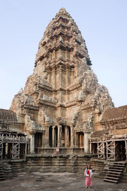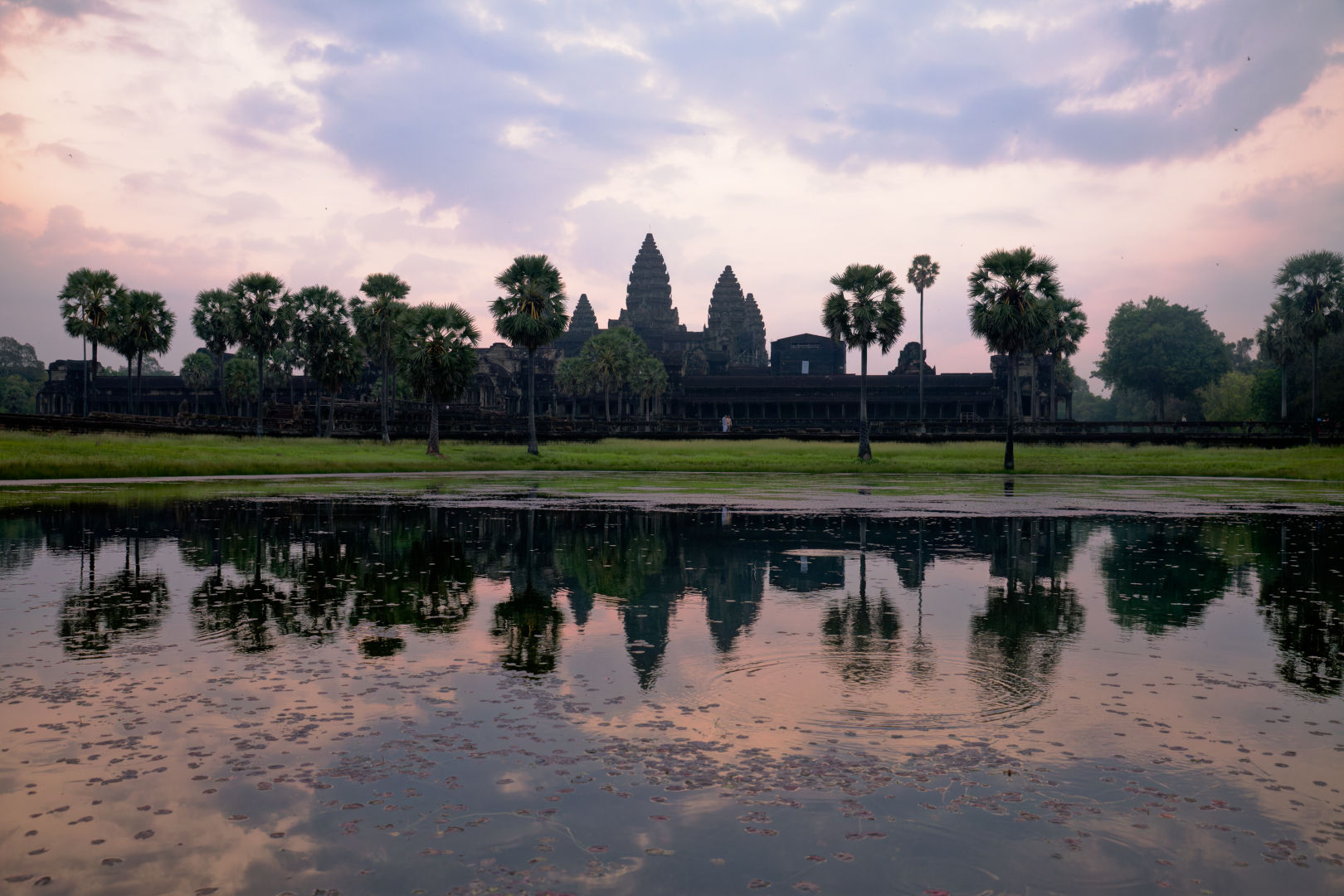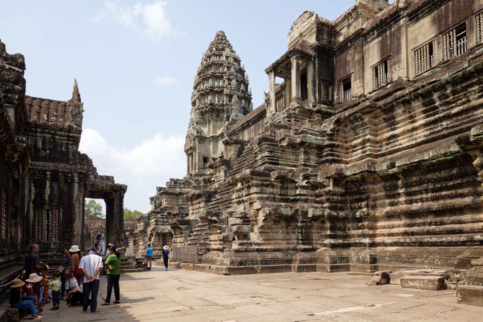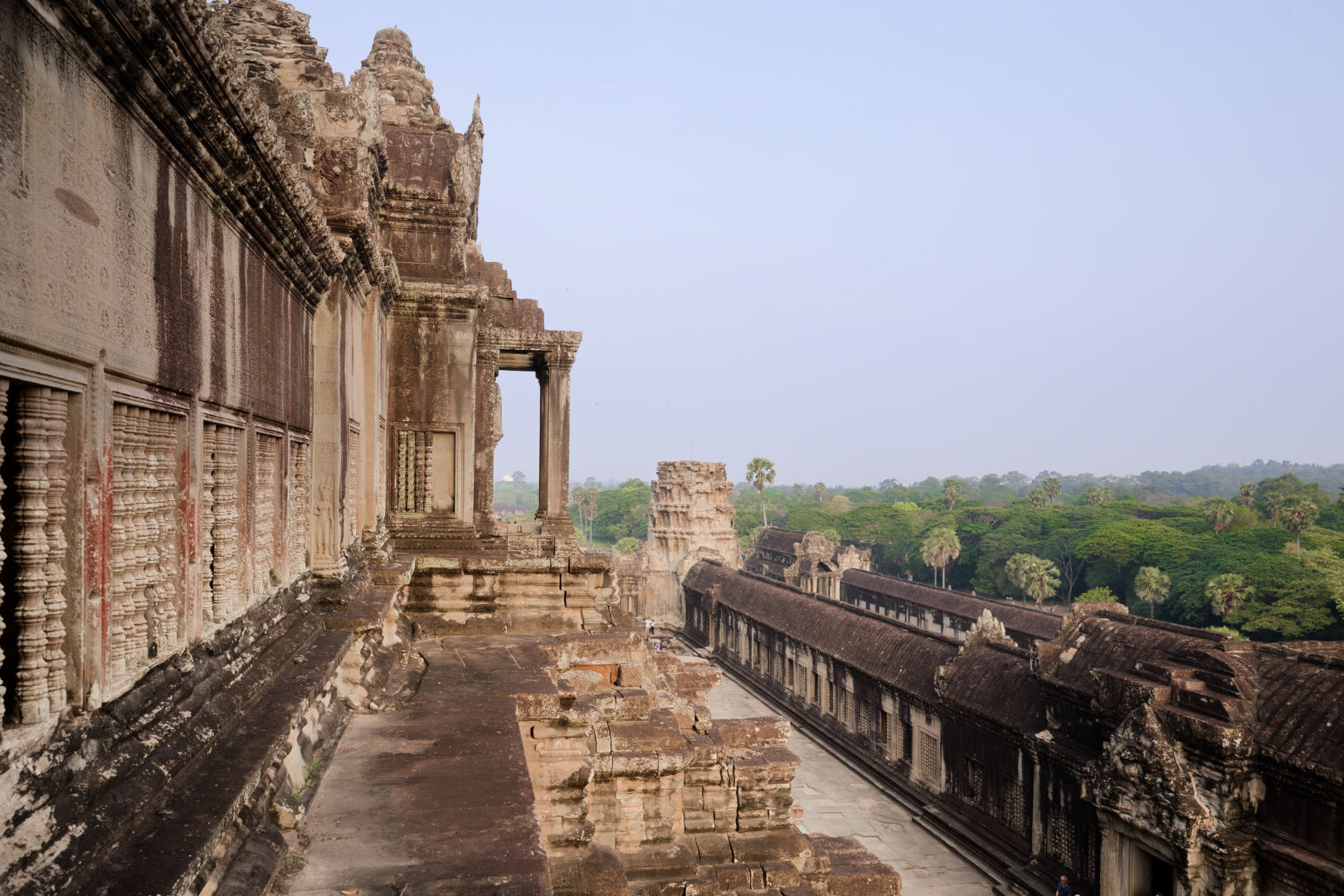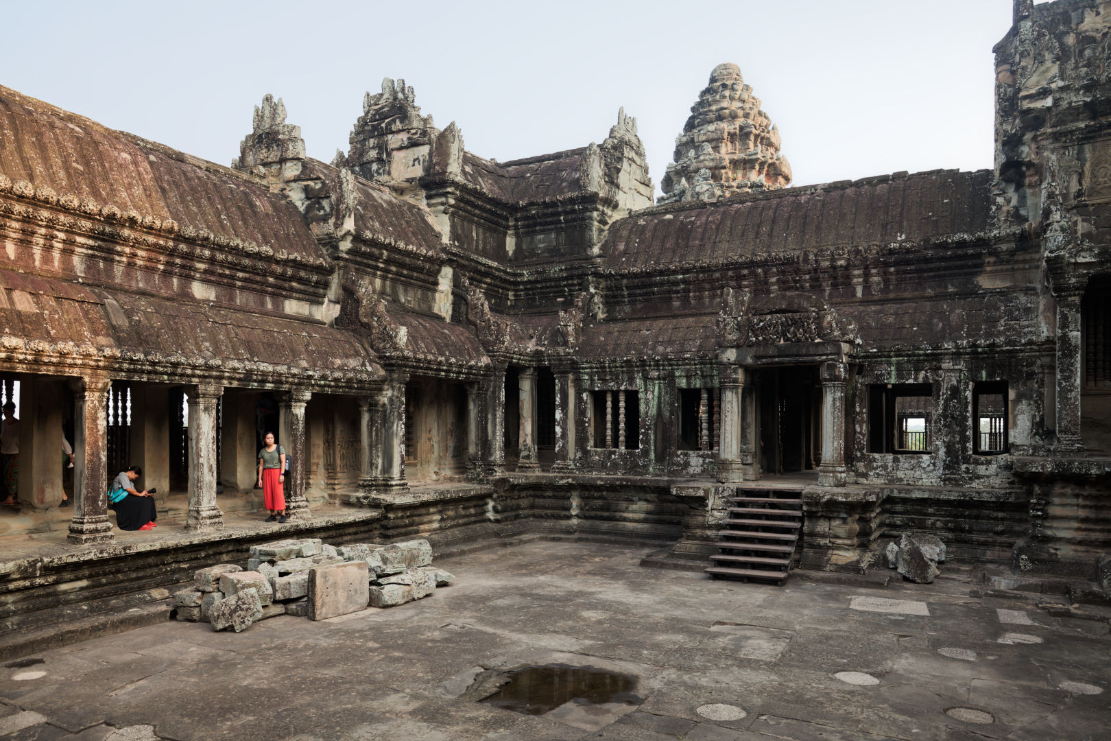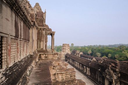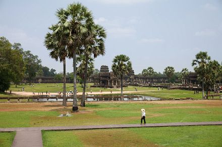Angkor Vat est le plus grand monument religieux du monde. Initialement hindou et dédié au dieu Vishnou, il a été construit durant la première moitié du XIIème siècle par le roi Suryavarman II. Il a progressivement été transformé en temple bouddhiste vers la fin du XIIème siècle. Orienté vers l'ouest, Angkor Vat comprend trois galeries rectangulaires et concentriques à l'intérieur de son mur d'enceinte entouré d'une large douve de 5 km de long.