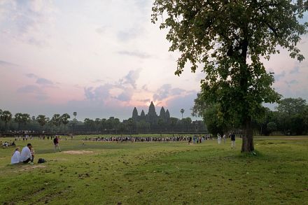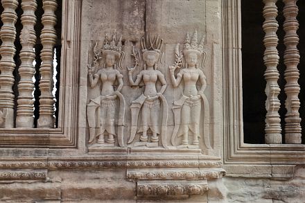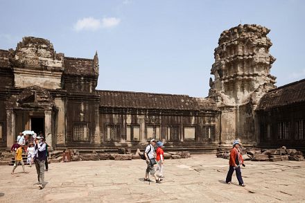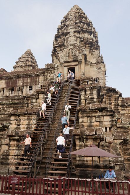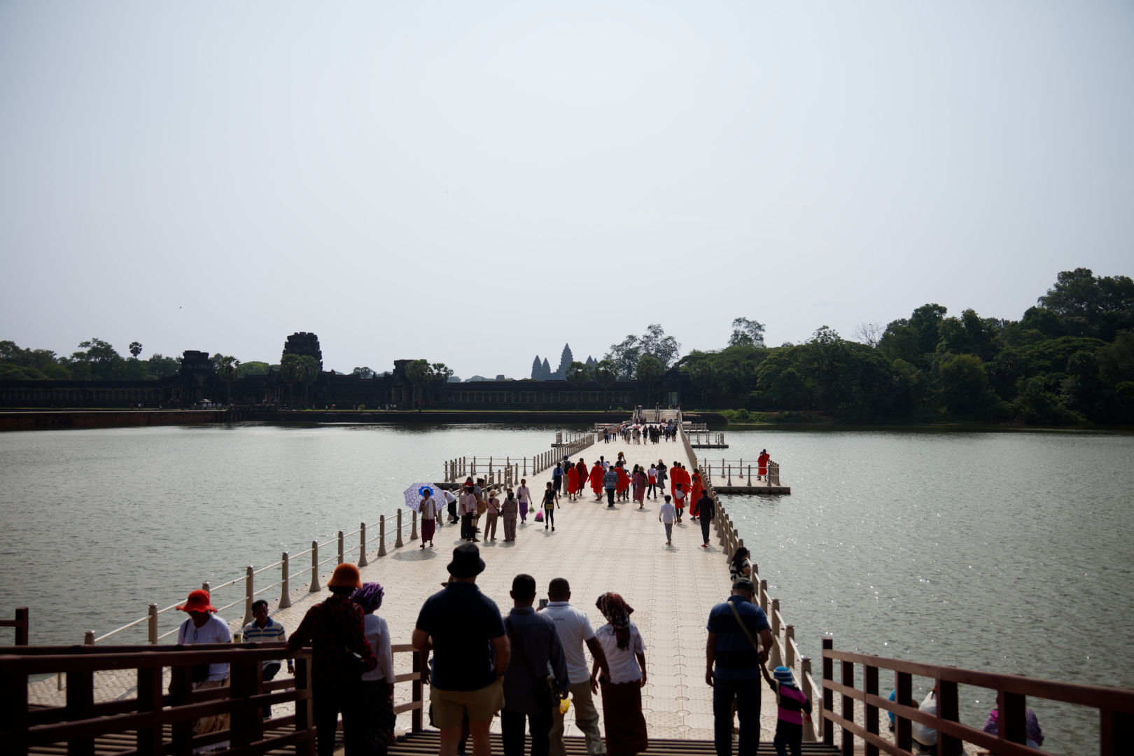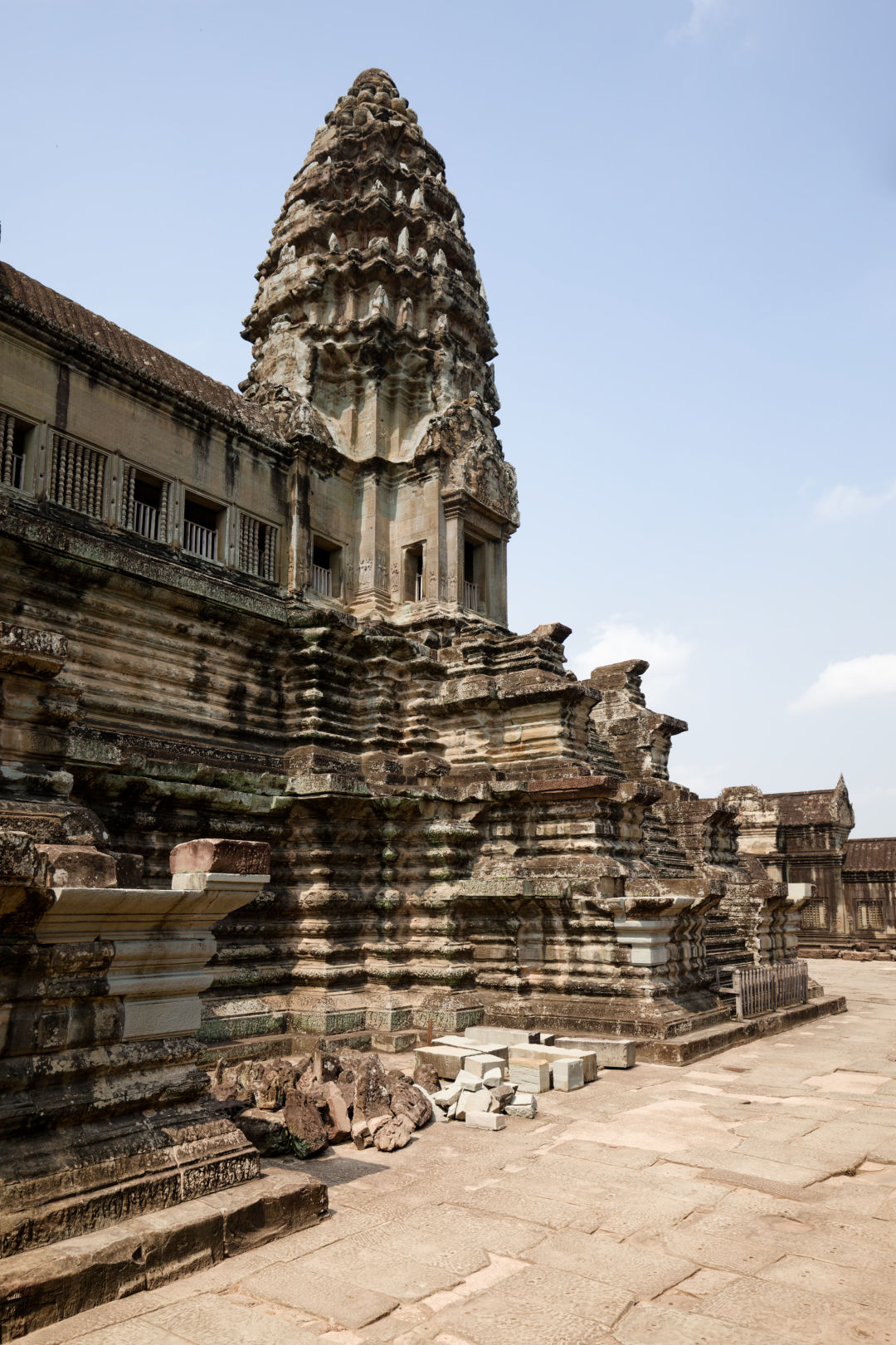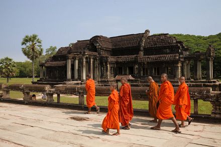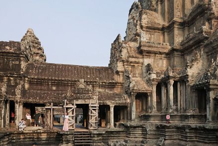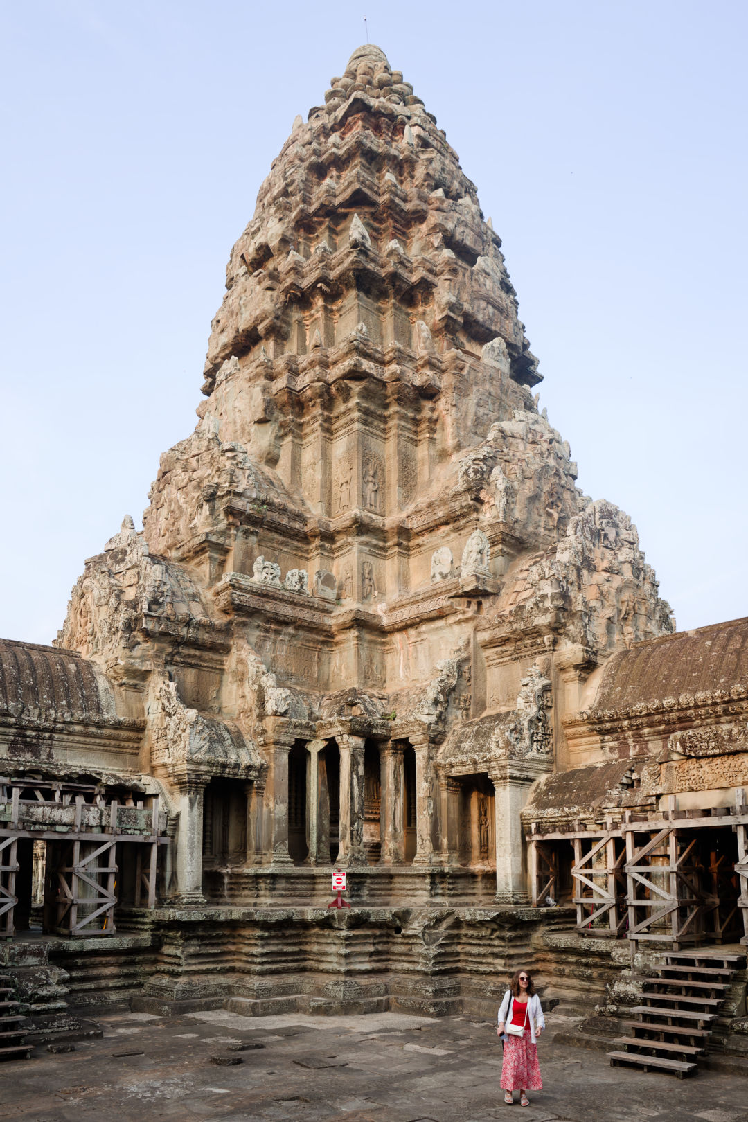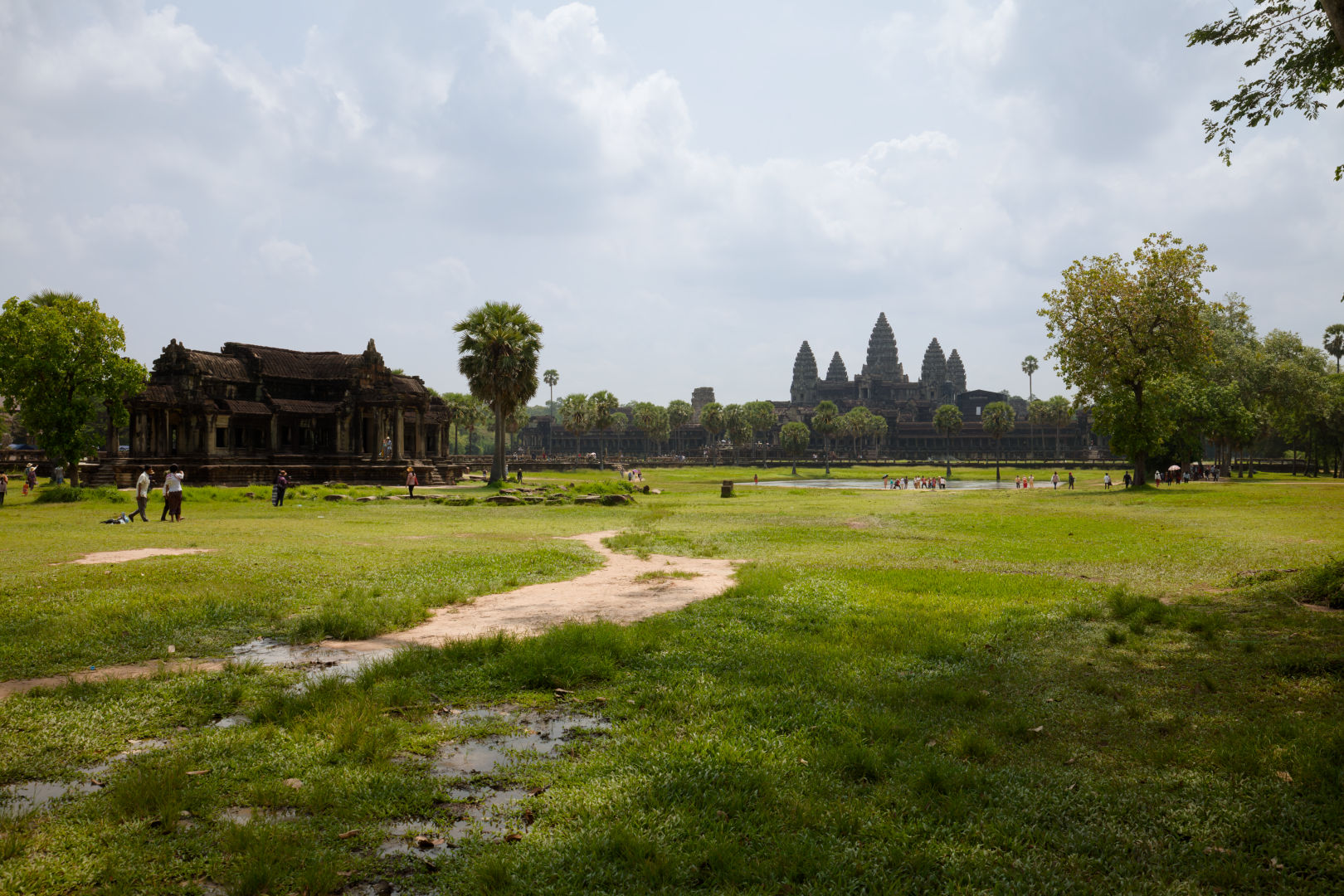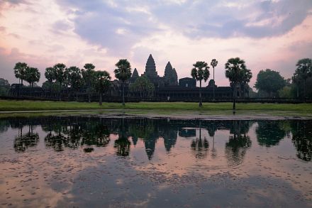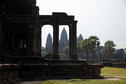Angkor Vat est le plus grand monument religieux du monde. Initialement hindou et dédié au dieu Vishnou, il a été construit durant la première moitié du XIIème siècle par le roi Suryavarman II. Il a progressivement été transformé en temple bouddhiste vers la fin du XIIème siècle. Orienté vers l'ouest, Angkor Vat comprend trois galeries rectangulaires et concentriques à l'intérieur de son mur d'enceinte entouré d'une large douve de 5 km de long.