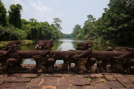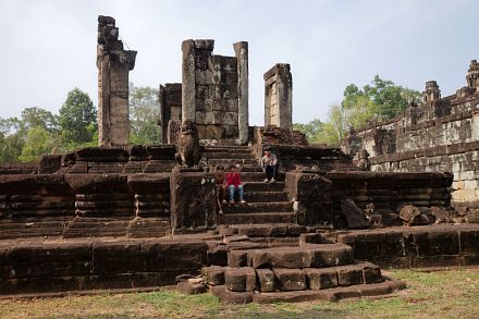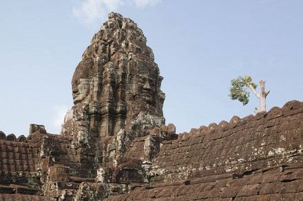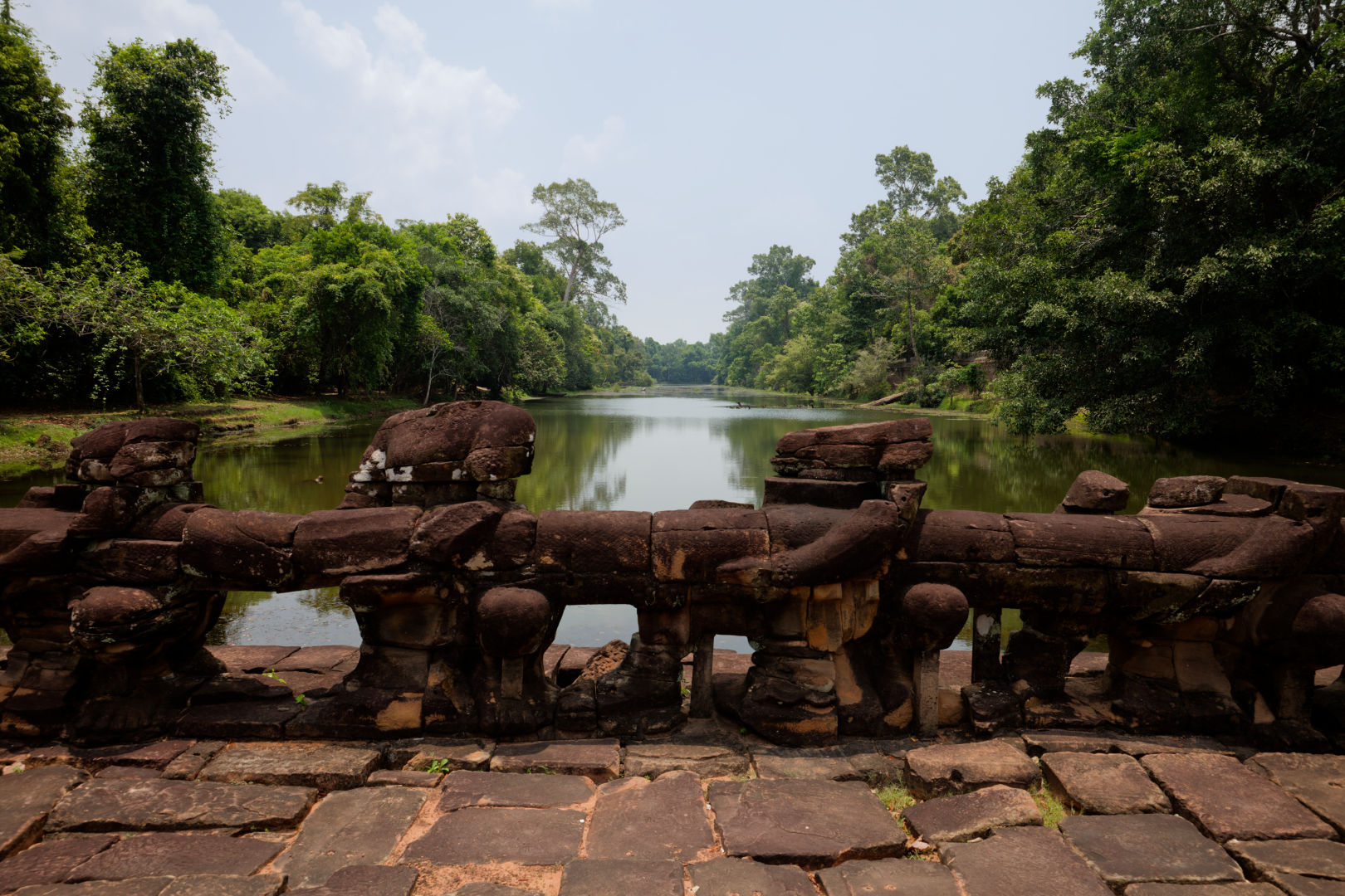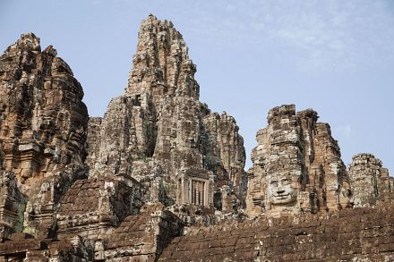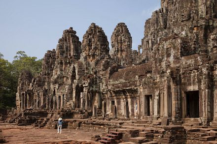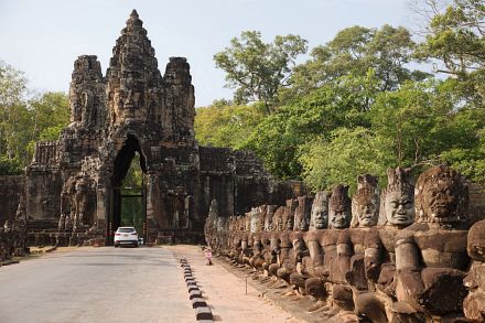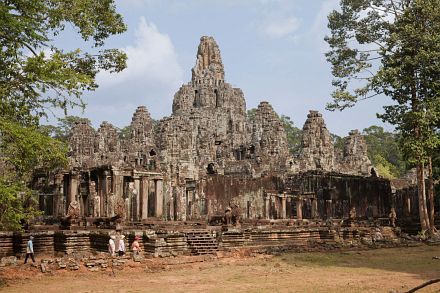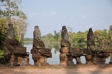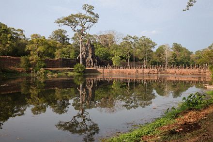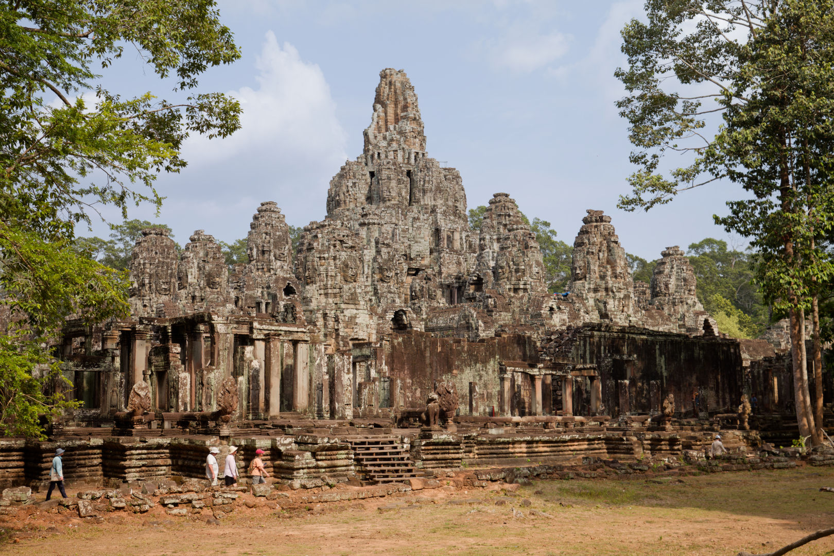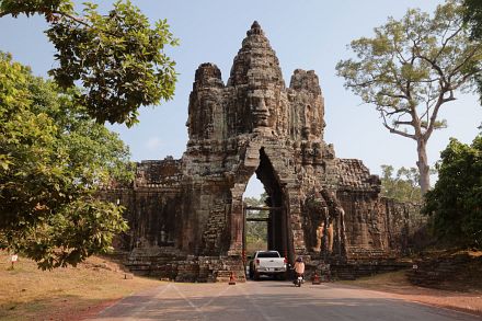 La cité royale d'Angkor Thom, dont le nom signifie "La grande cité", a la forme d'un carré d'environ trois kilomètres de côté. Angkor Thom a été édifiée par le roi bouddhiste Jayavarman VII entre la fin du XIIème et le début du XIIIème siècle. Il en fit la capitale de l'empire khmer après avoir chassé les Chams qui avaient mis Angkor à sac.
